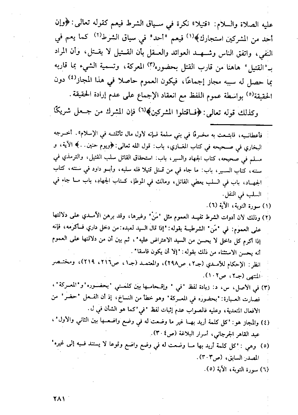 عليه الصلاة والسلام: (قتيلا) نكرة في سياق الشرط فيعم كقوله تعالى: {وإن أحد من المشركين استجارك} فيعم (أحد) في سياق الشرط كما يعم في النفي، واتفق الناس وشهد العوائد والعقل بأن القتيل لا يقتل، وأن المراد بـ (القتيل) ها هنا من قارب القتل بحضوره المعركة، وتسمية الشيء بما قاربه بما حصل له سببه مجاز إجماعا، فيكون العموم حاصلا في هذا المجاز دون الحقيقة بواسطة عموم مع انعقاد الإجماع على عدم إرادة الحقيقة.