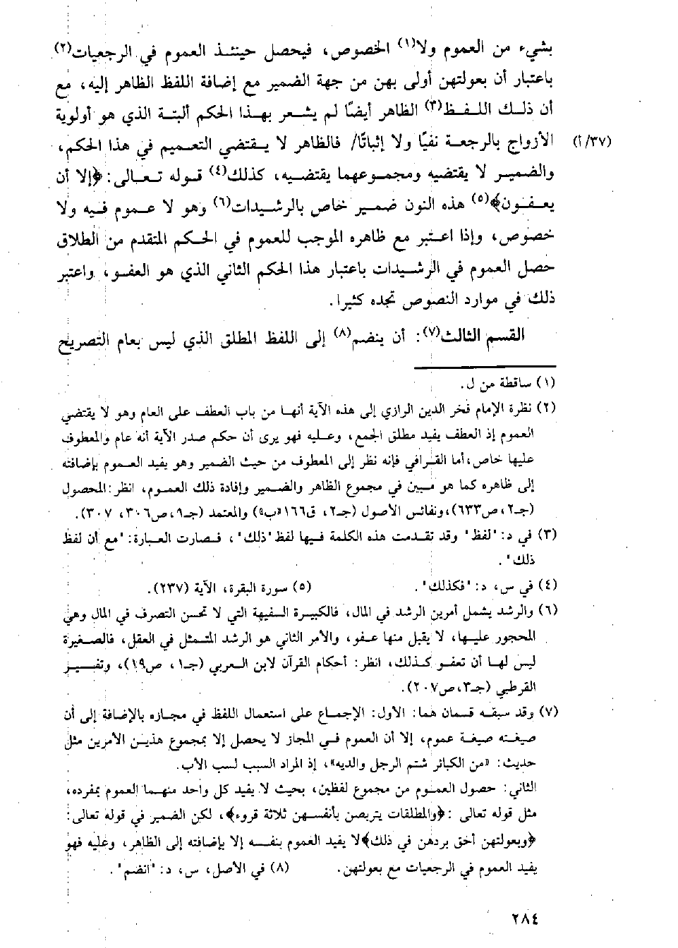 بشيء من العموم ولا الخصوص، فيحصل حينئذ العموم في الرجعيات باعتبار أن بعولتهن أولى بهن من جهة الضمير مع إضافة اللفظ الظاهر ليه، مع أن ذلك اللفظ الظاهر أيضا لم يشعر بهذا الحكم ألبتة الذي هو أولوية الأزواج بالرجعة نفيا ولا إثباتا/ فالظاهر لا يقتضى التعميم في هذا الحكم، والضمير لا يقتضيه ومجموعهما يقتضيه، كذلك قوله تعالى: {إلا أن يعفون} هذه النون ضمير خاص بالرشيدات وهو لا عموم فيه ولا خصوص، وإذا اعتبر مع ظاهره الموجب للعموم في الحكم المتقدم من الطلاق حصل العموم في الرشيدات باعتبار هذا الحكم الثاني الذي هو العفو، واعتبر ذلك في موارد النصوص تجده كثيرا.