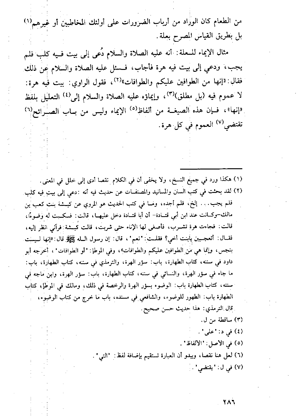 مثال الإيماء للعلة: أنه عليه الصلاة والسلام دعى إلى بيت فيه كلب فلم يجب، ودعي إلى بيت فيه هرة فأجاب، فسئل عليه الصلاة والسلام عن ذلك فقال: (إنها من الطوافين عليكم والطوافات)، فقول الراوي: بيت فيه هرة: لا عموم فيه (بل مطلق)، وإيماؤه عليه الصلاة والسلام إلى التعليل بلفظ (إنها)، فإن هذه الصيغة من ألفاظ الإيماء وليس من باب الصرائح تقتضي العموم في كل هرة.