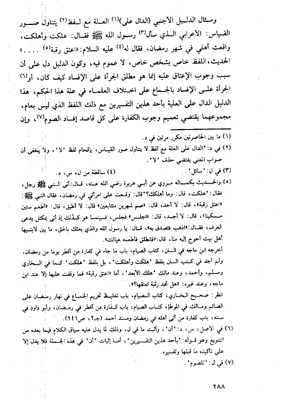 ومثال الدليل الأجنبي (الدال عل) العلة مع لفظ يتناول صور القياس: الأعرابي الذي سأل رسول الله - صلى الله عليه وسلم - فقال: هلكت وأهلكت، واقعت أهلي في شهر رمضان، فقال له عليه السلام: (اعتق رقبة ... ) الحديث، اللفظ خاص بشخص خاص، لا عموم فيه، وكون الدليل دل على أن سبب وجوب الإعتاق عليه إنما هو مطلق الجرأة على الإفساد كيف كان، أو الجرأة على الإفساد بالجماع على اختلاف العلماء في علة هذا الحكم، هذا الدليل الدال على العلية بأحد هذين التفسيرين مع ذلك اللفظ الذي ليس بعام، مجموعهما يقتضي تعميم وجوب الكفارة على كل قاصد إفساد الصوم، وإن