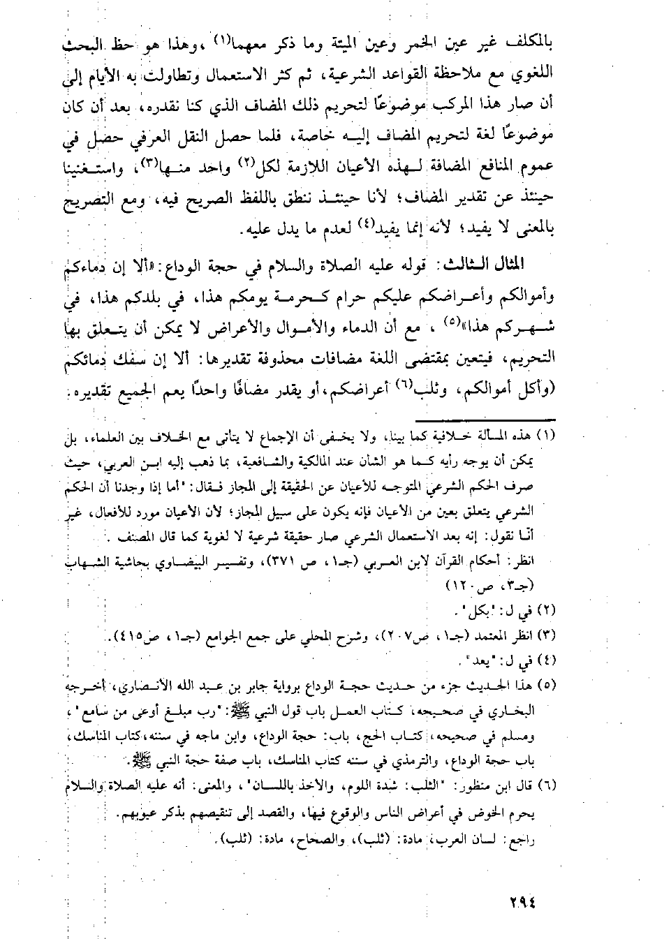 المثال الثالث: قوله عليه الصلاة والسلام في حجة الوداع: (ألا إن دماءكم وأموالكم وأعراضكم عليكم حرام كحرمة يومكم هذا، في بلدكم هذا، في شهركم هذا)، مع أن الدماء والأموال والأعراض لا يمكن أن يتعلق بها التحريم، فيتعين بمقتضى اللغة مضافات محذوفة تقديرها: ألا إن سفك دمائكم (وأكل أموالكم، وثلب أعراضكم، أو يقدر مضافا واحدا يعم الجميع تقديره.