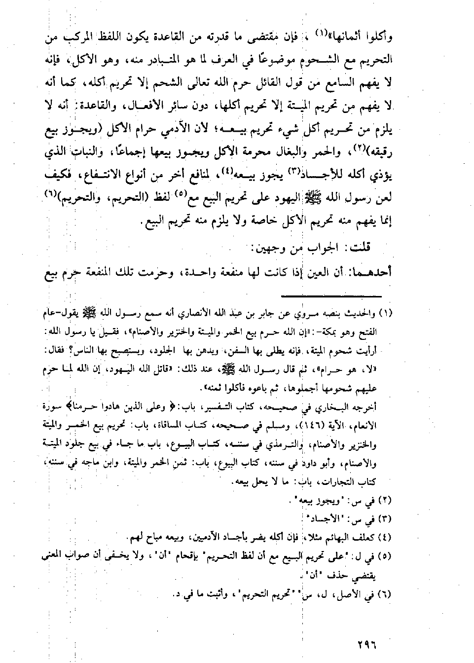 وأكلوا أثمانها)، فإن مقتضى ما قدرته من القاعدة يكون اللفظ المركب من التحريم مع الشحوم موضوعا في العرف لما هو المتبادر منه، وهو الأكل، فإنه لا يفهم السامع من قول القائل حرم الله تعالى الشحم إلا تحريم أكله، كما أنه لا يفهم من تحريم الميتة إلا تحريم أكلها، دون سائر الأفعال، والقاعدة: أنه لا يلزم من تحريم أكل شيء تحريم بيعه؛ لأن الآدمي حرام الأكل (ويجوز بيع رقيقه، والخمر وبالبغال محرمة الأكل ويجوز بيعها إجماعا، والنبات الذي لعن رسول الله - صلى الله عليه وسلم - اليهود على تحريم البيع مع لفظ (التحريم، والتحريم) إنما يفهم منه تحريم الأكل خاصة ولا يلزمن منه تحريم البيع.