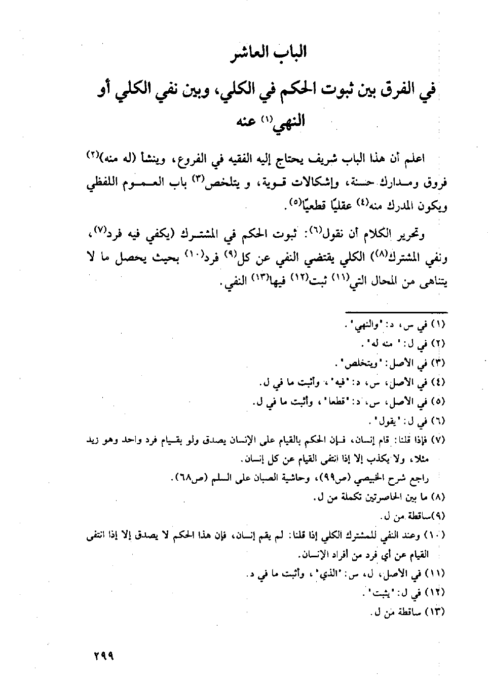 الباب العاشر في الفرق بين ثبوت الحكم في الكلي، وبين نفي الكلي أو النهي عنه