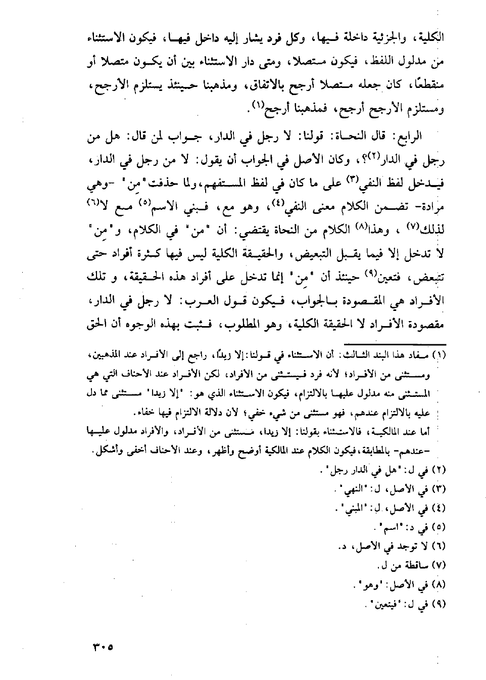 الرابع: قال النحاة: قولنا: لا رجل في الدار، جواب لمن قال: هل من رجل في الدار؟ ، وكان الأصل في الجواب أن يقول: لا من رجل في الدار، فيدخل لفظ النفي على ما كان في لفظ المستفهم، ولما حذفت (من) - وهي مرادة- تضمن الكلام معنى النفي، وهو مع، فبني الاسم مع لا لذلك، وهذا الكلام من النحاة يقتضي: أن (من) في الكلام، و (من) لا تدخل إلا فيما يقبل التبعيض، والحقيقة الكلية ليس فيها كثرة أفراد حتى تتبعض، فتعين حينئذ أن (من) إنما تدخل على أفراد هذه الحقيقة، وتلك الأفراد هي المقصود بالجواب، فيكون قول العرب: لا رجل في الدار، مقصودة الأفراد لا الحقيقة الكلية، وهو المطلوب، فثبت بهذه الوجوه أن الحق