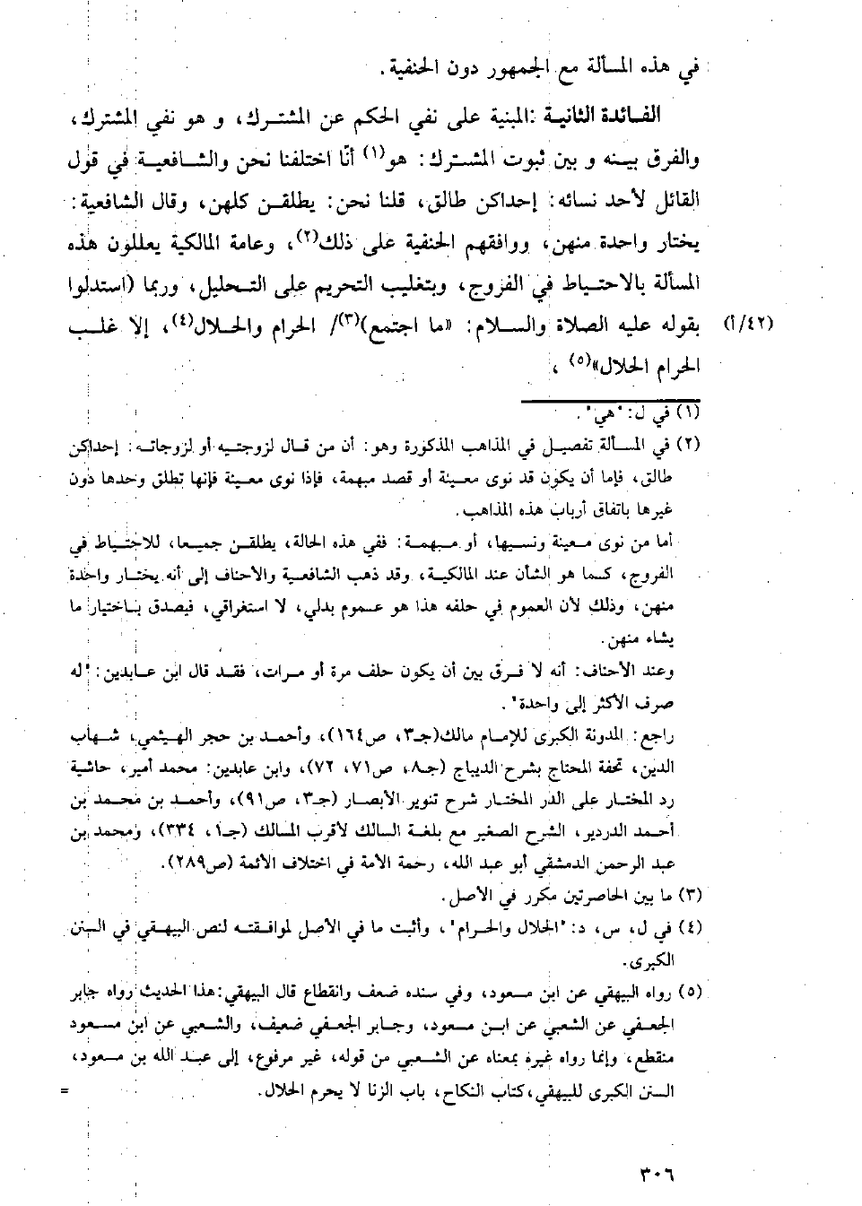 الفائدة الثانية: المبنية على نفي الحكم عن المشترك، وهو نفي المشترك، والفرق بينه وبين ثبوت المشترك: هو أنا اختلفنا نحن والشافعية في قول القائل لأحد نسائه: إحداكن طالق، قلنا نحن: يطلقن كلهن، وقال الشافعية: يختار واحدة منهن، ووافقهم الحنفية على ذلك، وعامة المالكية يعللون هذه المسألة بالاحتياط في الفروج، وبتغليب التحريم على التحليل، وربما (استدلوا بقوله عليه الصلاة والسلام: (ما اجتمع) / الحرام والحلال، إلا غلب الحرام الحلال) ـ