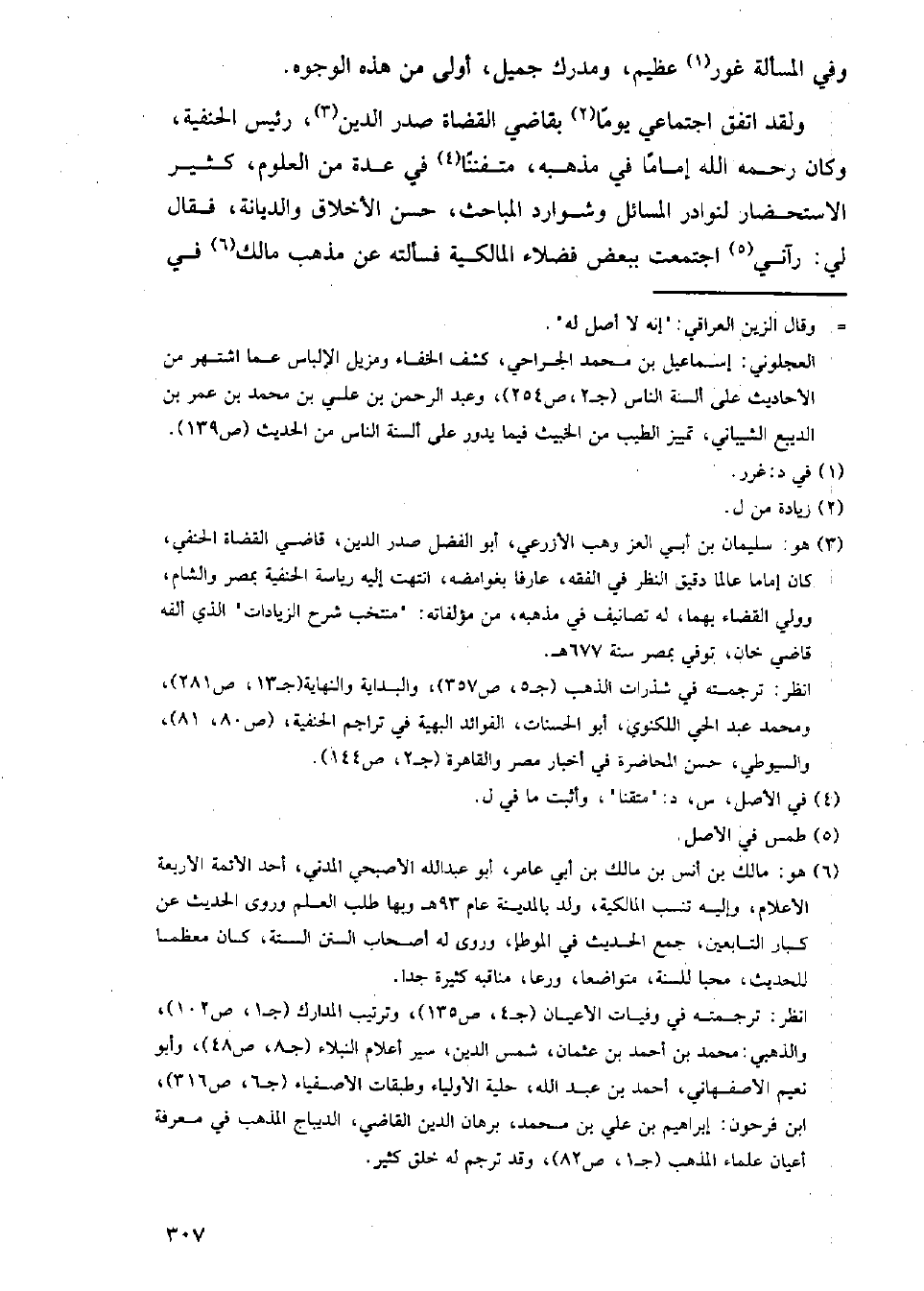 ولقد اتفق اجتماعي يوما بقاضي القضاة صدر الدين، رئيس الحنفية، وكان رحمه الله إماما في مذهبه، متفننا في عدة من العلوم، كثير الاستحضار لنوادر المسائل وشوارد المباحث، حسن الأخلاق والديانة، فقال لي: رآني اجتمعت ببعض فضلاء المالكية فسألته عن مذهب مالك في