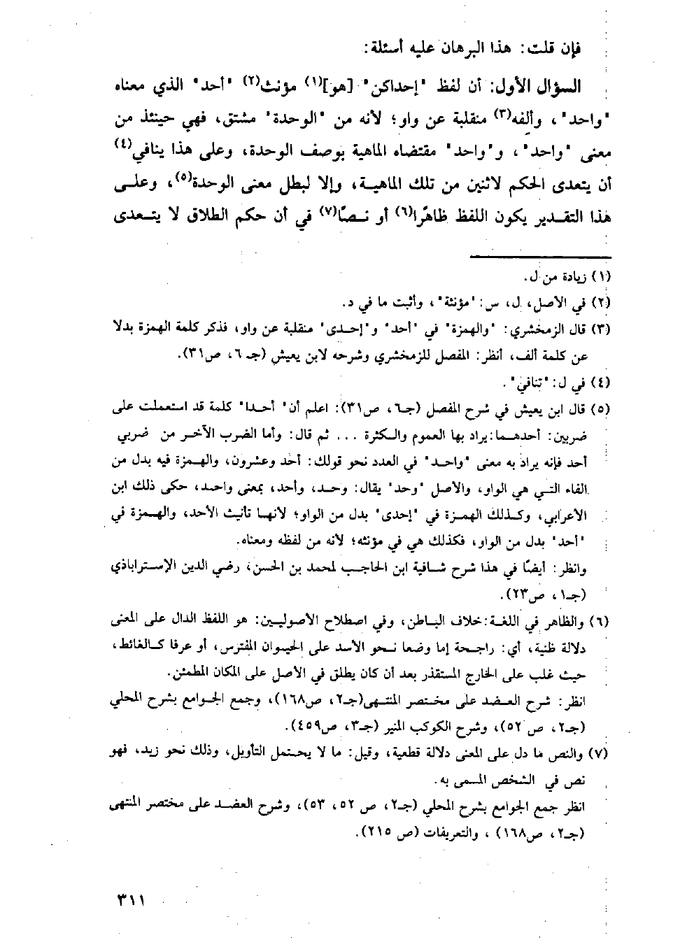 السؤال الأول: أن لفظ (إحداكن) [هو] مؤنث (أحد) الذي معناه (واحد)، وألفه منقلبة عن واو؛ لأنه من (الوحدة) مشتق، فهي حينئذ من معنى (واحد)، و (واحد) مقتضاه الماهية بوصف الوحدة، وعلى هذا ينافي أن يتعدى الحكم لاثنين من تلك الماهية، وإلا لبطل معنى الوحدة، وعلى هذا التقدير يكون اللفظ ظاهرا أو نصا في أن حكم الطلاق لا يتعدى