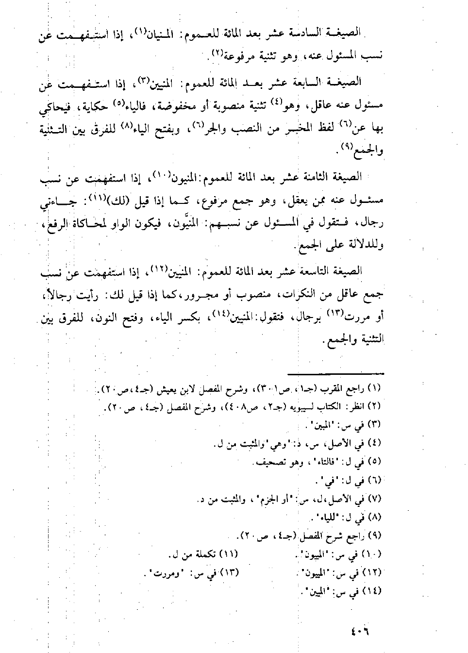 الصيغة التاسعة عشر بعد المائة للعموم: المنيين، إذا استفهمت عن نسب جمع عاقل من النكرات، منصوب أو مجرور، كما إذا قيل لك: رأيت رجالا، أو مررت برجال، فتقول: المنيين، بكسر الياء، وفتح النون، للفرق بين التثنية والجمع.