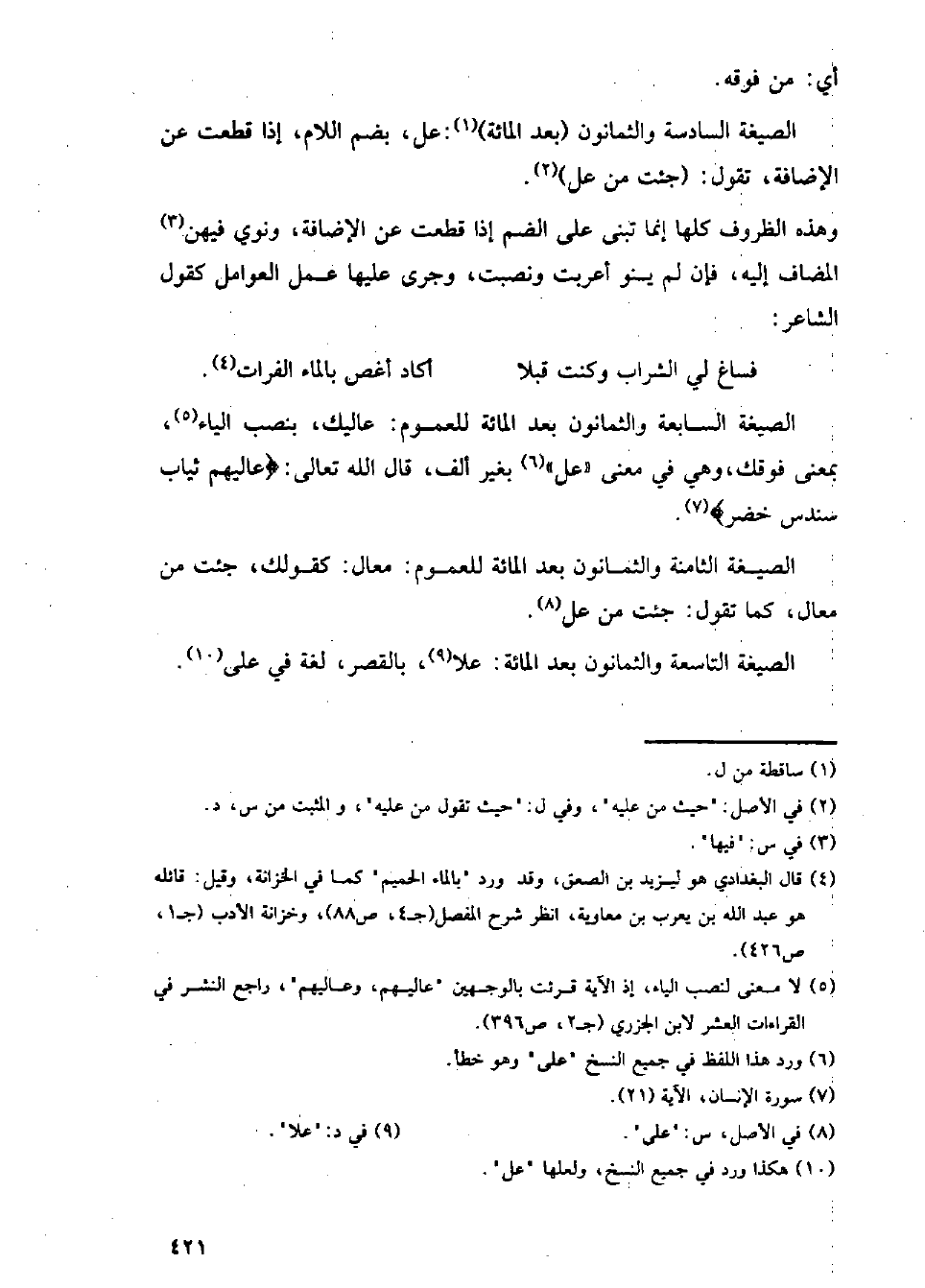 الصيغة السادسة والثمانون (بعد المائة): عل، بضم اللام، إذا قطعت عن الإضافة، تقول: (جئت من عل).