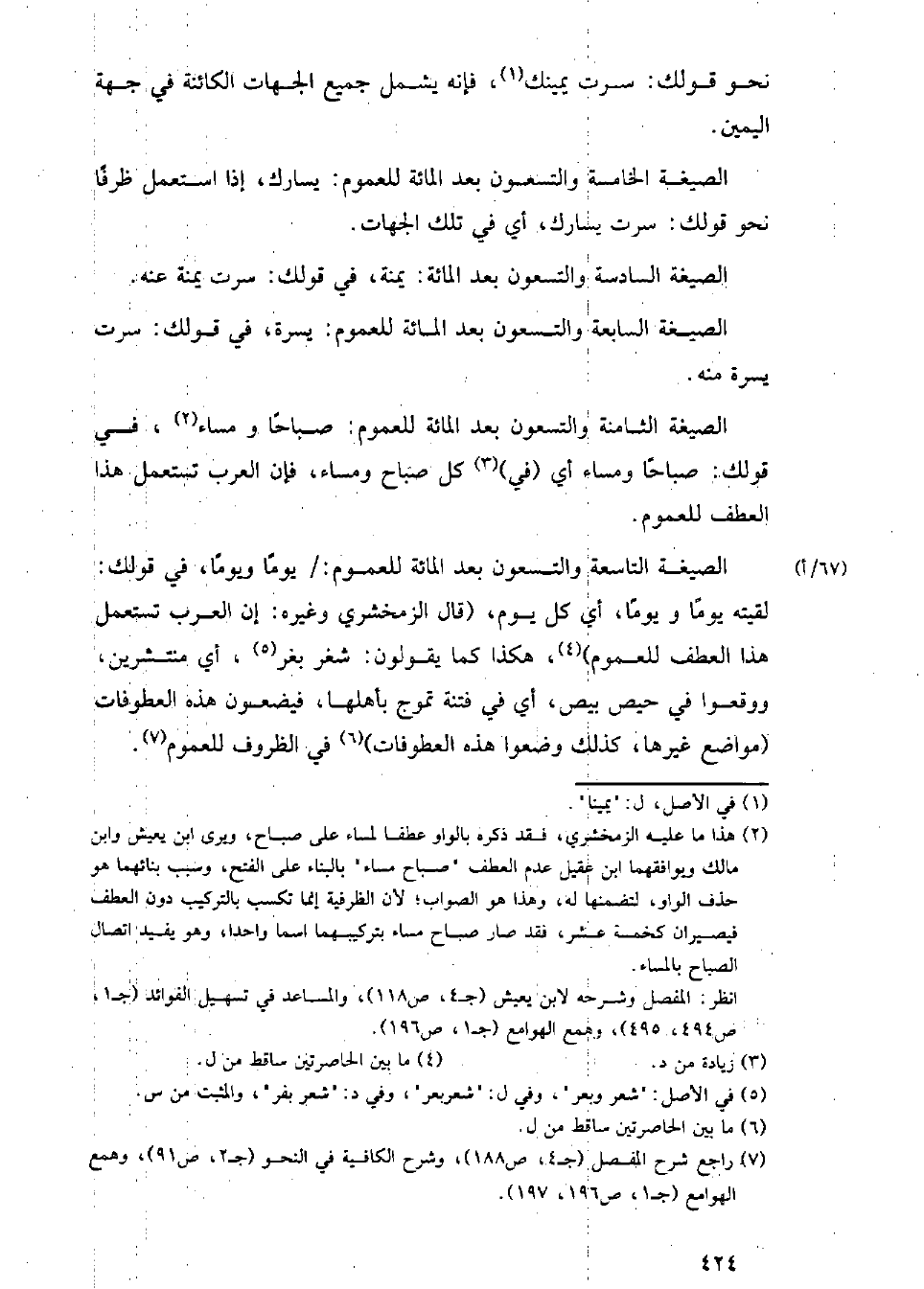 الصيغة الثامنة والتسعون بعد المائة للعموم: صباحا ومساء، في قولك: صباحا ومساء أي (في) كل صباح ومساء، فإن العرب تستعمل هذا العطف للعموم.