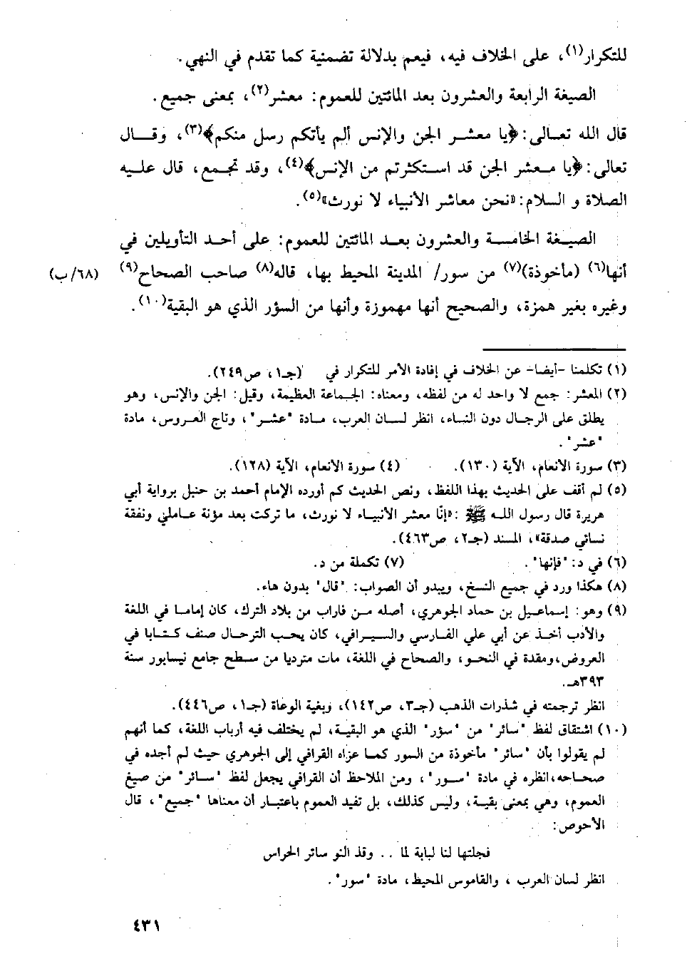 الصيغة الخامسة والعشرون بعد المائتين للعموم: على أحد التأويلين في أنها (مأخوذة) من سور المدينة المحيط بها، قاله صاحب الصحاح وغيره بغير همزة، والصحيح أنها مهموزة وأنها من السؤر الذي هو البقية.
