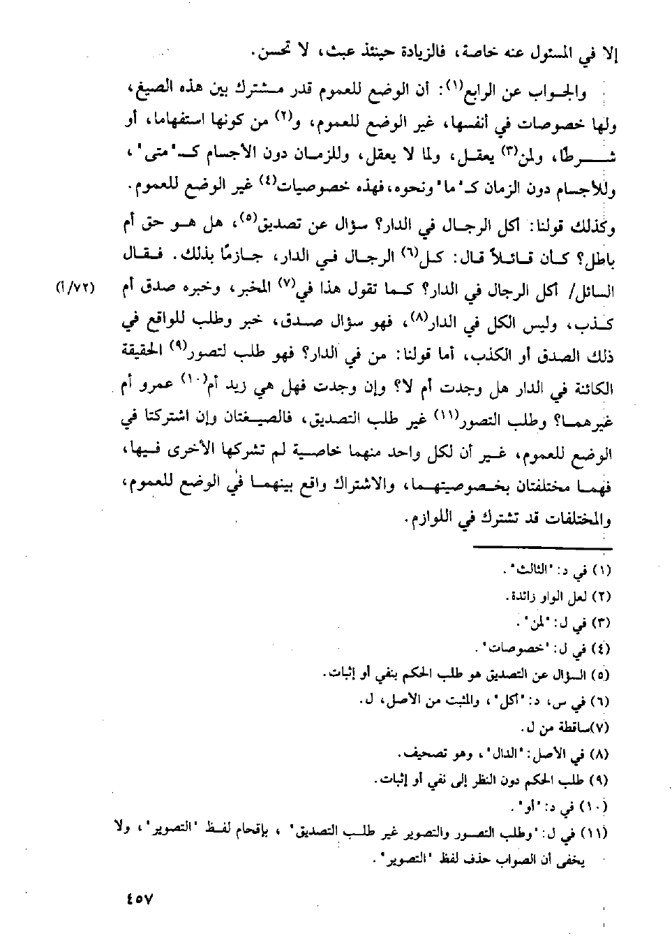 والجواب عن الرابع: أن الوضع للعموم قدر مشترك بين هذه الصيغ، ولها خصوصات في أنفسها، غير الوضع للعموم، ومن كونها استفهاما، أو شرطا، ولمن يعقل، ولما لا يعقل، وللزمان دون الأجسام كـ (متى)، وللأجسام دون الزمان كـ (ما) ونحوه، فهذه خصوصيات غير الوضع للعموم. وكذلك قولنا: أكل الرجال في الدار؟ سؤال عن تصديق، هل هو حق أم باطل؟ كأن قائلا قال: كل الرجال في الدار، جازما بذلك. فقال السائل/ أكل الرجال في الدار؟ كما تقول هذا في المخبر، وخبره صدق أم كذب، وليس الكل في الدار، فهو سؤال صدق، خبر وطلب للواقع في ذلك الصدق أو الكذب، أما قولنا: من في الدار؟ فهو طلب لتصور الحقيقة الكائنة في الدار هل وجدت أم لا؟ وإن وجدت فهل هي زيد أم عمرو أم غيرهما؟ وطلب التصور غير طلب التصديق، فالصيغتان وإن اشتركتا في الوضع للعموم، غير أن لكل واحد منهما خاصية لم تشركها الأخرى فيها، فهما مختلفتان بخصوصيتهما، والاشتراك واقع بينهما في الوضع للعموم، والمختلفات قد تشترك في اللوازم.