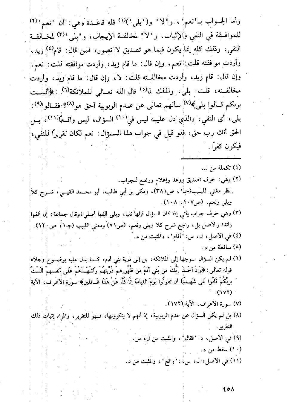 وأما الجواب بـ (نعم)، و (لا) و ((بلى)) فله قاعدة وهي: أن (نعم) للموافقة في النفي والإثبات، و (لا) لمخالفة الإيجاب، و (بلى) لمخالفة النفي، وذلك كله إنما يكون فيما هو تصديق لا تصور، فمن قال: قام زيد، وأردت موافقته قلت: نعم، وإن قال: ما قام زيد، وأردت موافقته قلت: نعم، وإن قال: قام زيد، وأردت مخالفته قلت: لا، وإن قال: ما قام زيد، وأردت مخالفته، قلت: بلى، ولذلك لما قال الله تعالى للملائكة: {ألست بربكم قالوا بلى} سألهم تعالى عن عدم الربوبية أحق هو؟ فقالوا: بلى، أي النفي، والذي دل عليه ليس في السؤال، ليس واقعا، بل الحق أنك رب حق، فلو قيل في جواب هذا السؤال: نعم لكان تقريرا للنفي، فيكون كفرا.