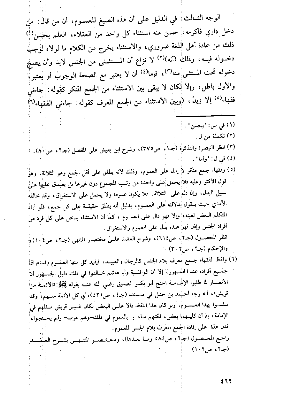 الوجه الثالث: في الدليل على أن هذه الصيغ للعموم، أن من قال: من دخل داري فأكرمه، حسن منه استثناء كل واحد من العقلاء، العلم بحسن ذلك من عادة أهل اللغة ضروري، والاستثناء يخرج من الكلام ما لولاه لوجب دخوله فيه، وذلك (أنه) لا نزاع أن المستثنى من الجنس لابد وأن يصح دخوله تحت المستثنى منه، فإما أن لا يعتبر مع الصحة الوجوب أو يعتبر، والأول باطل، وإلا لكان لا يبقى بين الاستثناء من الجمع المنكر كقوله: جاءني فقهاء إلا زيدا، (وبين الاستثناء من الجمع المعرف كقوله: جاءني الفقهاء
