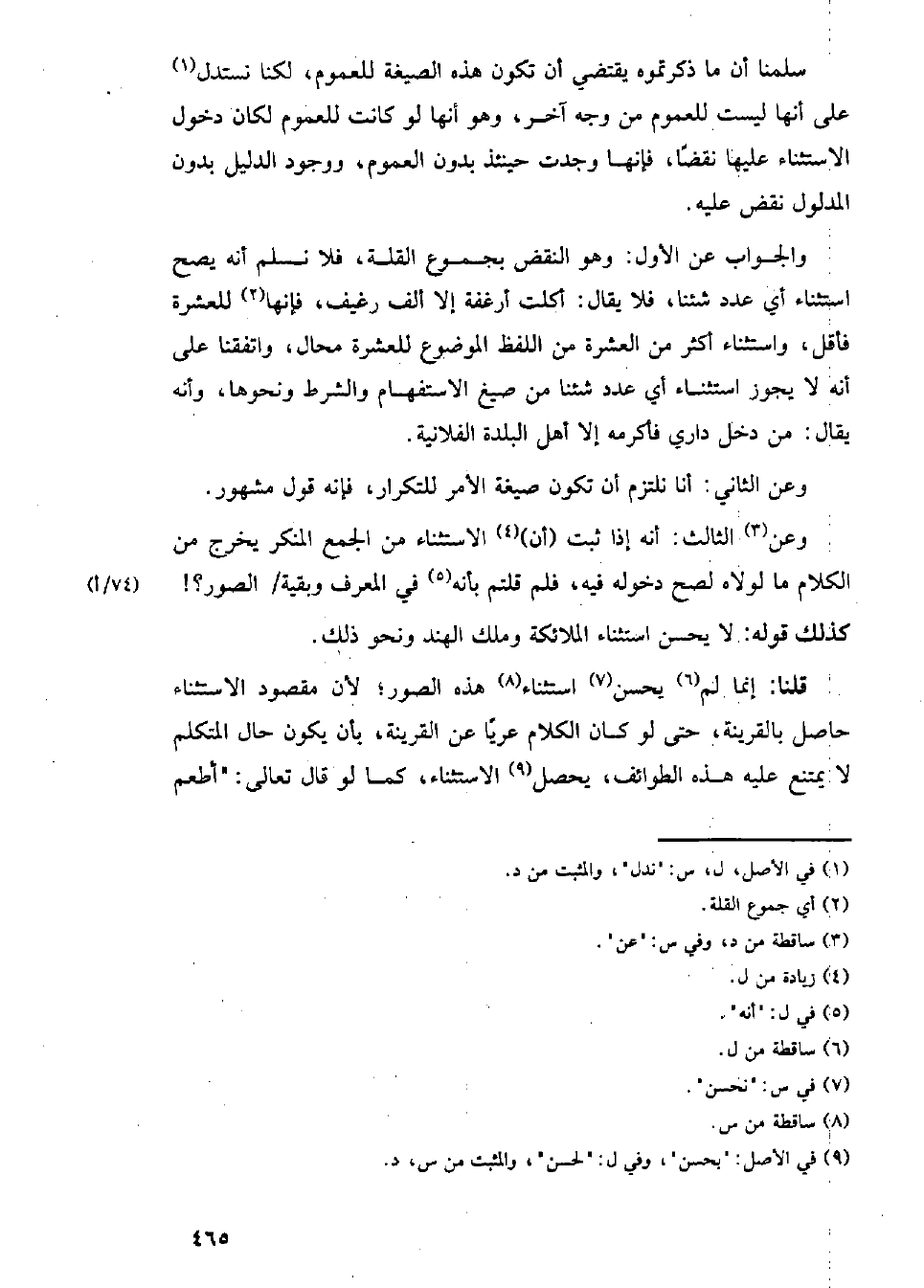 وعن الثالث: أنه إذا صبت (أن) الاستثناء من الجمع المنكر يخرج من الكلام ما لولاه لصح دخوله فيه، فلم قلتم بأنه في المعرف وبقية/ الصور؟ ! كذلك قوله: لا يحسن استثناء الملائكة وملك الهند ونحو ذلك.