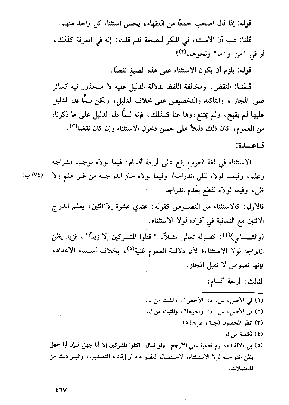 الاستثناء في لغة العرب يقع على أربعة أقسا: فيما لولاه لوجب اندراجه وعلم، وفيما لولاه لظن اندراجه/ وفيما لولاه لجاز اندراجه من غير علم ولا ظن، وفيما لولاه لقطع بعدم اندراجه.
