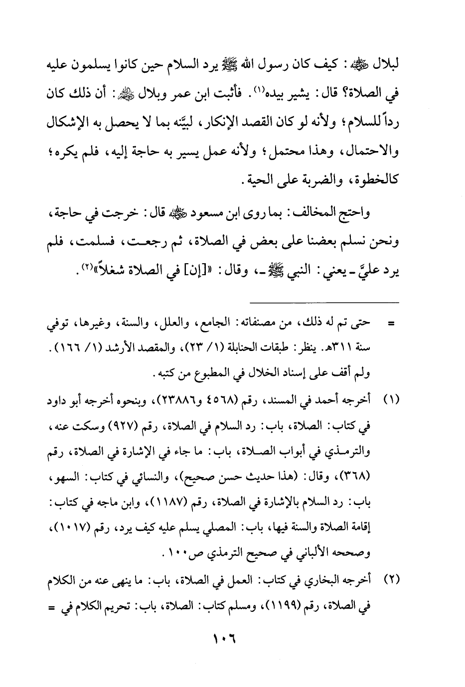 (¬1) أخرجه أحمد في المسند، رقم (4568 و 23886)، وبنحوه أخرجه أبو داود في كتاب: الصلاة، باب: رد السلام في الصلاة، رقم (927) وسكت عنه، والترمذي في أبواب الصلاة، باب: ما جاء في الإشارة في الصلاة، رقم (368)، وقال: (هذا حديث حسن صحيح)، والنسائي في كتاب: السهو، باب: رد السلام بالإشارة في الصلاة، رقم (1187)، وابن ماجه في كتاب: إقامة الصلاة والسنة فيها، باب: المصلي يسلم عليه كيف يرد، رقم (1017)، وصححه الألباني في صحيح الترمذي ص 100.