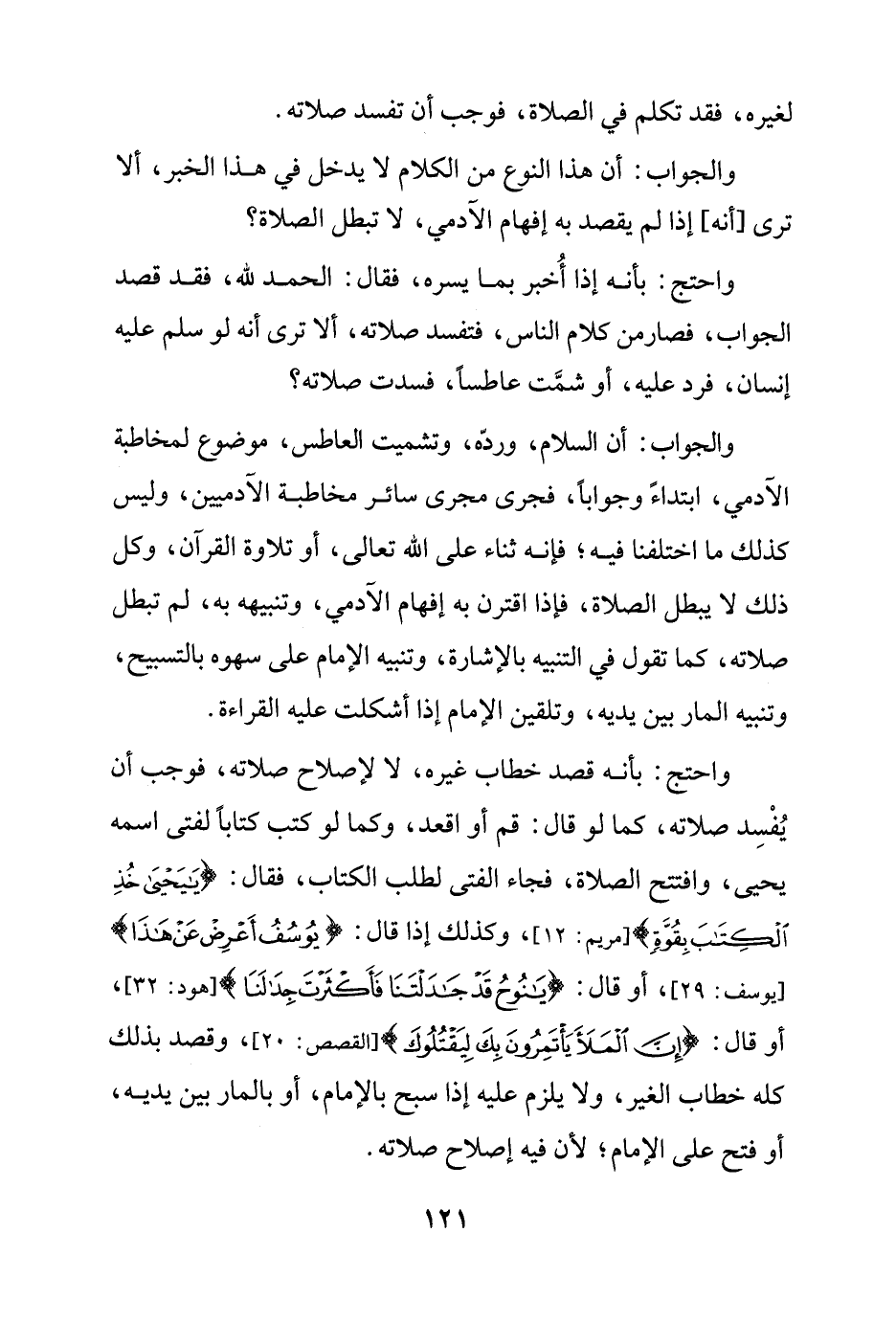 واحتج: بأنه قصد خطاب غيره، لا لإصلاح صلاته، فوجب أن يُفْسِد صلاته، كما لو قال: قم أو اقعد، وكما لو كتب كتابًا لفتى اسمه يحيى، وافتتح الصلاة، فجاء الفتى لطلب الكتاب، فقال: {يَايَحْيَى خُذِ الْكِتَابَ بِقُوَّةٍ} [مريم: 12]، وكذلك إذا قال: {يُوسُفُ أَعْرِضْ عَنْ هَذَا} [يوسف: 29]، أو قال: {يَانُوحُ قَدْ جَادَلْتَنَا فَأَكْثَرْتَ جِدَالَنَا} [هود: 32]، أو قال: {إِنَّ الْمَلَأَ يَأْتَمِرُونَ بِكَ لِيَقْتُلُوكَ} [القصص: 20]، وقصد بذلك كله خطاب الغير، ولا يلزم عليه إذا سبح بالإمام، أو بالمار بين يديه، أو فتح على الإمام؛ لأن فيه إصلاح صلاته.