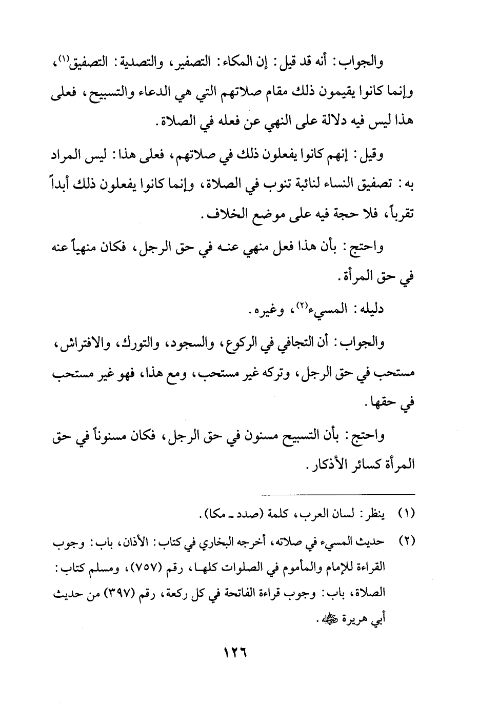 وقيل: إنهم كانوا يفعلون ذلك في صلاتهم، فعلى هذا: ليس المراد به: تصفيق النساء لنائبة تنوب في الصلاة، وإنما كانوا يفعلون ذلك أبدًا تقربًا، فلا حجة فيه على موضع الخلاف.