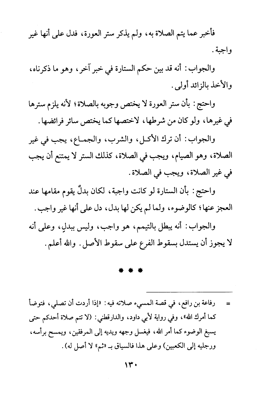 فأخبر عما يتم الصلاة به، ولم يذكر ستر العورة، فدل على أنها غير واجبة.