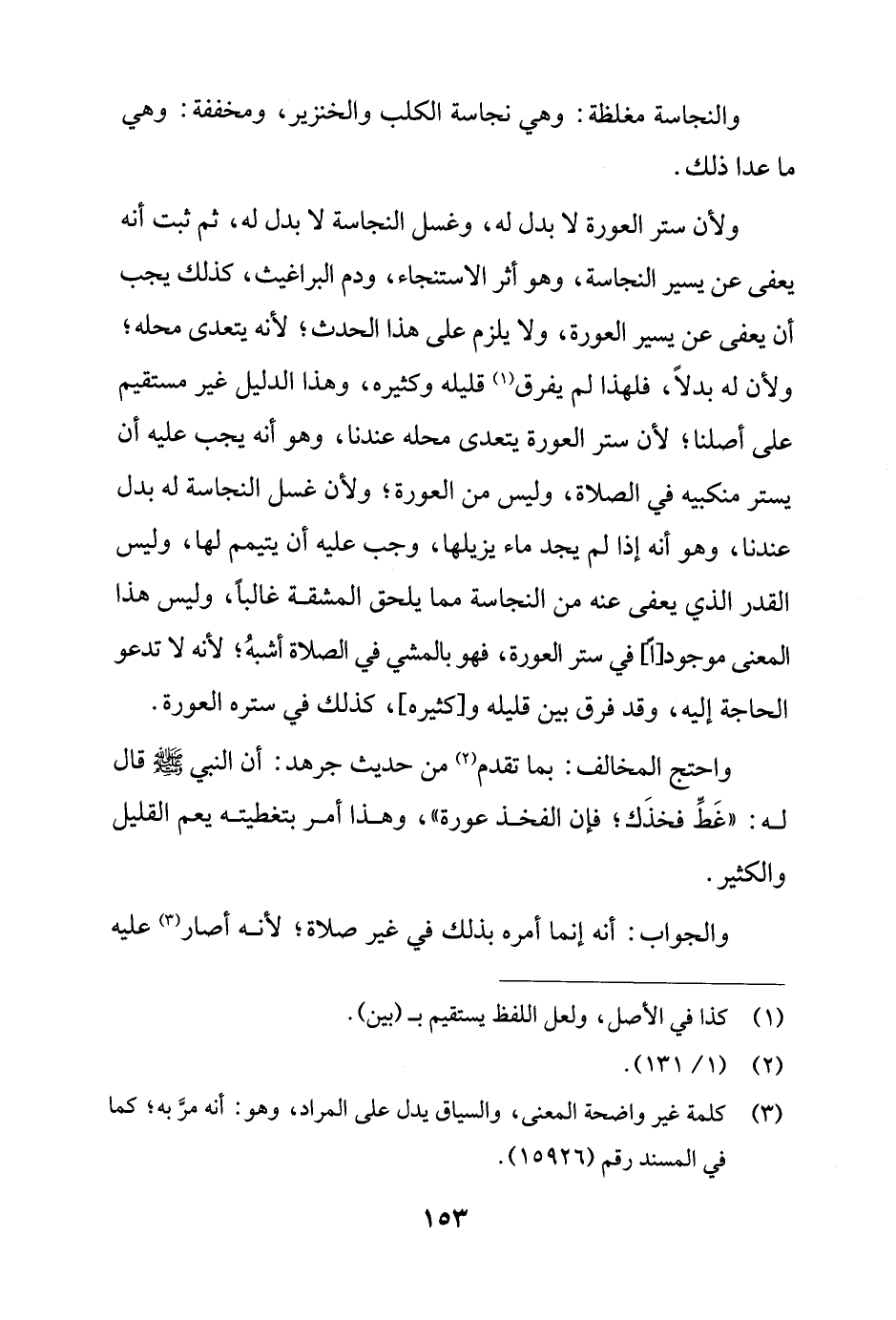 ولأن ستر العورة لا بدل له، وغسل النجاسة لا بدل له، ثم ثبت أنه يعفى عن يسير النجاسة، وهو أثر الاستنجاء، ودم البراغيث، كذلك يجب أن يعفى عن يسير العورة، ولا يلزم على هذا الحدث؛ لأنه يتعدى محله؛ ولأن له بدلًا، فلهذا لم يفرق (¬1) قليله وكثيره، وهذا الدليل غير مستقيم على أصلنا؛ لأن ستر العورة يتعدى محله عندنا، وهو أنه يجب عليه أن يستر منكبيه في الصلاة، وليس من العورة؛ ولأن غسل النجاسة له بدل عندنا، وهو أنه إذا لم يجد ماء يزيلها، وجب عليه أن يتيمم لها، وليس القدر الذي يعفى عنه من النجاسة مما يلحق المشقة غالبًا، وليس هذا المعنى موجود [اً] في ستر العورة، فهو بالمشي في الصلاة أشبهُ؛ لأنه لا تدعو الحاجة إليه، وقد فرق بين قليله و [كثيره]، كذلك في ستره العورة.