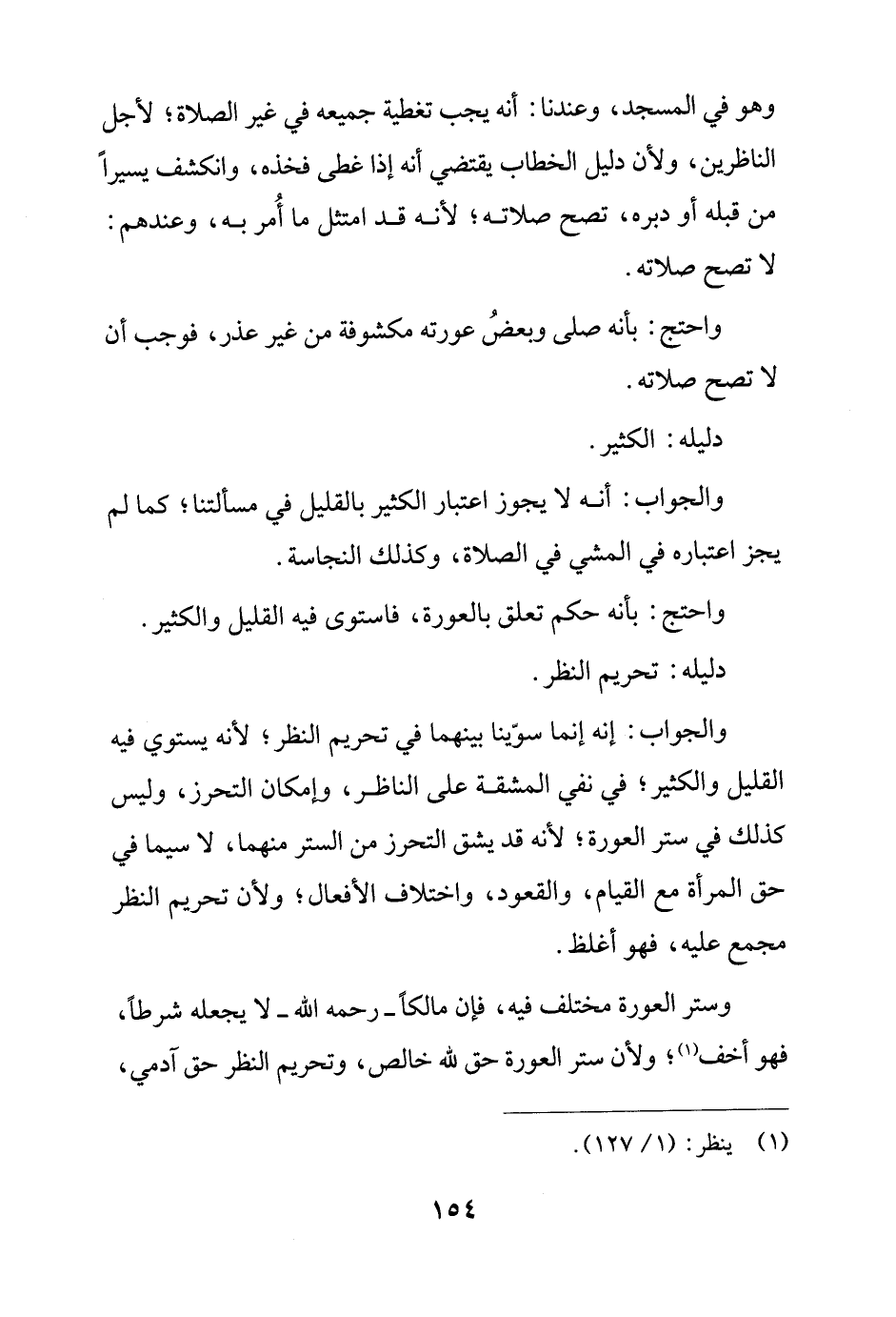 والجواب: إنه إنما سوّينا بينهما في تحريم النظر، لأنه يستوي فيه القليل والكثير؛ في نفي المشقة على الناظر، وإمكان التحرز، وليس كذلك في ستر العورة؛ لأنه قد يشق التحرز من الستر منهما، لا سيما في حق المرأة مع القيام، والقعود، واختلاف الأفعال؛ ولأن تحريم النظر مجمع عليه، فهو أغلظ.