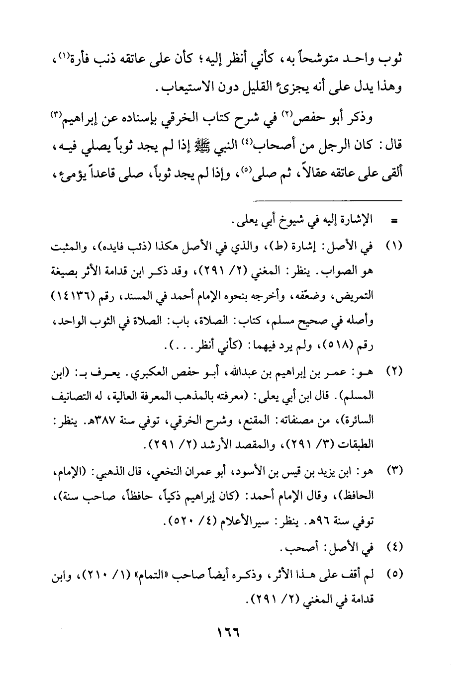 (¬1) في الأصل: إشارة (ط)، والذي في الأصل هكذا (ذئب فايده)، والمثبت هو الصواب. ينظر: المغني (2/ 291)، وقد ذكر ابن قدامة الأثر بصيغة التمريض، وضعّفه، وأخرجه بنحوه الإمام أحمد في المسند، رقم (14136) وأصله في صحيح مسلم، كتاب: الصلاة، باب: الصلاة في الثوب الواحد، رقم (518)، ولم يرد فيهما: (كأني أنظر ... ).