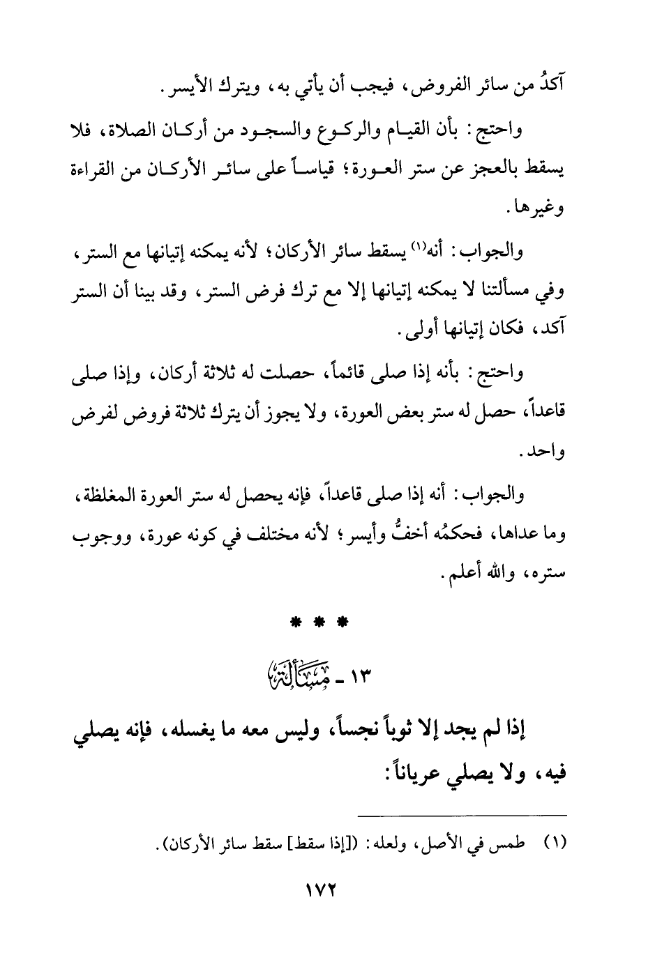 13 - مَسْألَة: إذا لم يجد إلا ثوبًا نجسًا، وليس معه ما يغسله، فإنه يصلي فيه، ولا يصلي عريانًا: