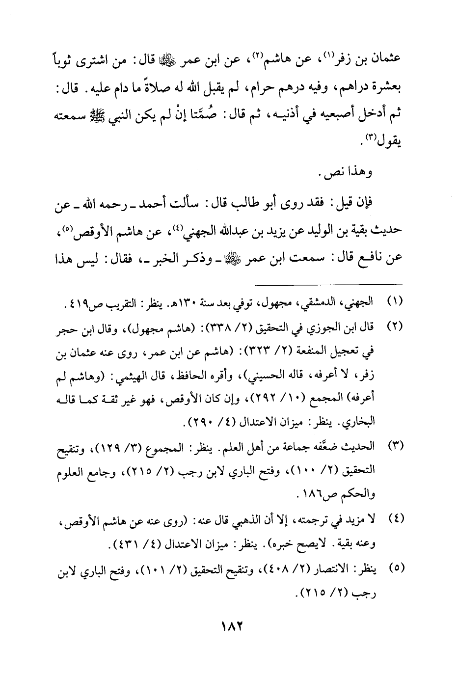 عثمان بن زفر (¬1)، عن هاشم (¬2)، عن ابن عمر - رضي الله عنهما - قال: من اشترى ثوبًا بعشرة دراهم، وفيه درهم حرام، لم يقبل الله له صلاةً ما دام عليه. قال: ثم أدخل أصبعيه في أذنيه، ثم قال: صُمَّتا إنْ لم يكن النبي - صلى الله عليه وسلم - سمعته يقول (¬3).
