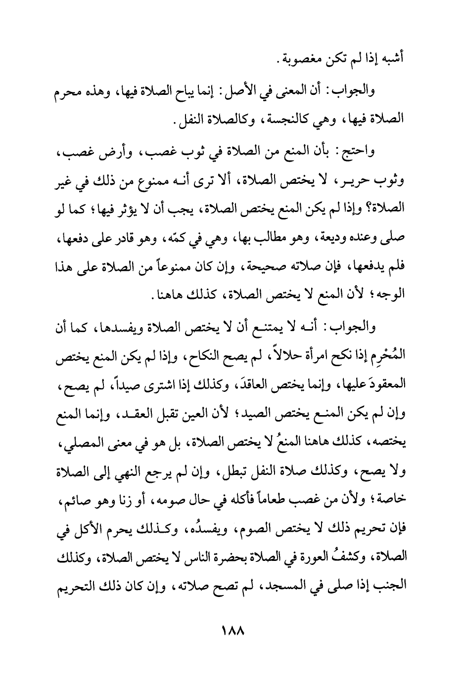 والجواب: أنه لا يمتنع أن لا يختص الصلاة ويفسدها، كما أن المُحْرِم إذا نكح امرأة حلالًا، لم يصح النكاح، وإذا لم يكن المنع يختص المعقودَ عليها، وإنما يختص العاقدَ، وكذلك إذا اشترى صيدًا، لم يصح، وإن لم يكن المنع يختص الصيد؛ لأن العين تقبل العقد، وإنما المنع يختصه، كذلك ها هنا المنعُ لا يختص الصلاة، بل هو في معنى المصلي، ولا يصح، وكذلك صلاة النفل تبطل، وإن لم يرجع النهي إلى الصلاة خاصة؛ ولأن من غصب طعامًا فأكله في حال صومه، أو زنا وهو صائم، فإن تحريم ذلك لا يختص الصوم، ويفسدُه، وكذلك يحرم الأكل في الصلاة، وكشفُ العورة في الصلاة بحضرة الناس لا يختص الصلاة، وكذلك الجنب إذا صلى في المسجد، لم تصح صلاته، وإن كان ذلك التحريم