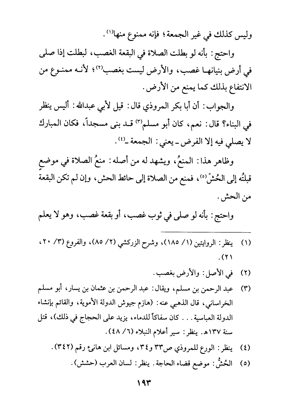 والجواب: أن أبا بكر المروذي قال: قيل لأبي عبد الله: أليس ينظر في البناء؟ قال: نعم، كان أبو مسلم (¬3) قد بنى مسجدًا، فكان المبارك لا يصلي فيه إلا الفرض - يعني: الجمعة - (¬4).
