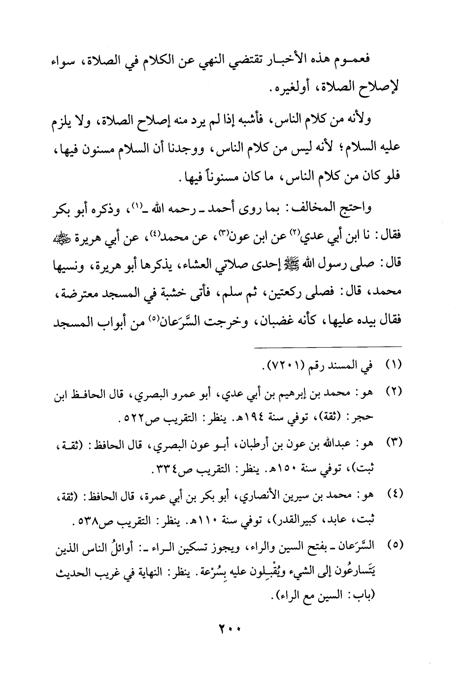 واحتج المخالف: بما روى أحمد - رحمه الله - (¬1)، وذكره أبو بكر فقال: نا ابن أبي عدي (¬2) عن ابن عون (¬3)، عن محمد (¬4)، عن أبي هريرة - رضي الله عنه - قال: صلى رسول الله - صلى الله عليه وسلم - إحدى صلاتي العشاء، يذكرها أبو هريرة، ونسيها محمد، قال: فصلى ركعتين، ثم سلم، فأتى خشبة في المسجد معترضة، فقال بيده عليها، كأنه غضبان، وخرجت السَّرَعان (¬5) من أبواب المسجد