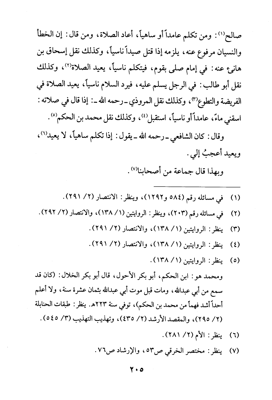 صالح (¬1): ومن تكلم عامدًا أو ساهيًا، أعاد الصلاة، ومن قال: إن الخطأ والنسيان مرفوع عنه، يلزمه إذا قتل صيدًا ناسيًا، وكذلك نقل إسحاق بن هانئ عنه: في إمام صلى بقوم، فيتكلم ناسيًا، يعيد الصلاة (¬2)، وكذلك نقل أبو طالب: في الرجل يسلم عليه، فيرد السلام ناسيًا، يعيد الصلاة في الفريضة والتطوع (¬3)، وكذلك نقل المروذي - رحمه الله -: إذا قال في صلاته: اسقني ماءً، عامدًا أو ناسيًا، استقبل (¬4)، وكذلك نقل محمد بن الحكم (¬5).