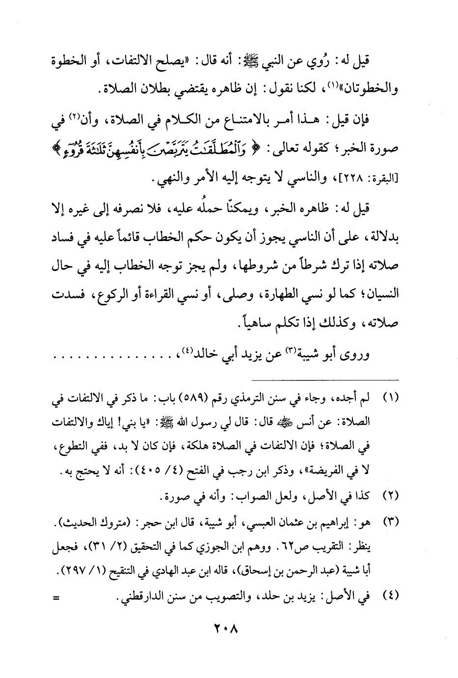 قيل له: ظاهره الخبر، ويمكنّا حملُه عليه، فلا نصرفه إلى غيره إلا بدلالة، على أن الناسي يجوز أن يكون حكم الخطاب قائمًا عليه في فساد صلاته إذا ترك شرطًا من شروطها، ولم يجز توجه الخطاب إليه في حال النسيان؛ كما لو نسي الطهارة، وصلى، أو نسي القراءة أو الركوع، فسدت صلاته، وكذلك إذا تكلم ساهيًا.