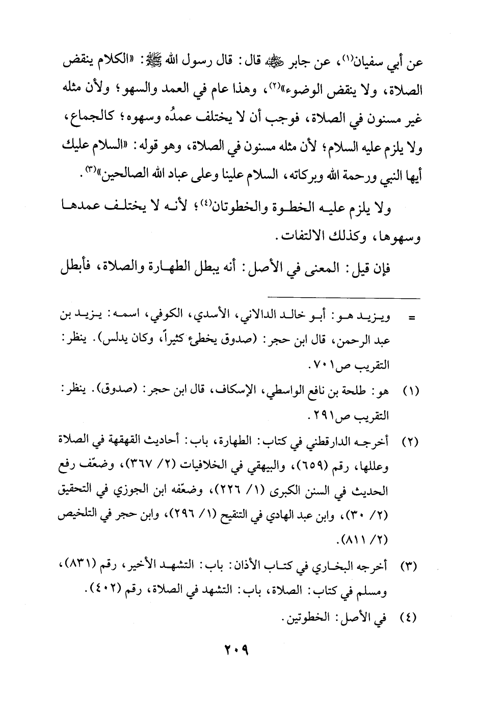 عن أبي سفيان (¬1)، عن جابر - رضي الله عنه - قال: قال رسول الله - صلى الله عليه وسلم -: "الكلام ينقض الصلاة، ولا ينقض الوضوء" (¬2)، وهذا عام في العمد والسهو؛ ولأن مثله غير مسنون في الصلاة، فوجب أن لا يختلف عمدُه وسهوه؛ كالجماع، ولا يلزم عليه السلام؛ لأن مثله مسنون في الصلاة، وهو قوله: "السلام عليك أيها النبي ورحمة الله وبركاته، السلام علينا وعلى عباد الله الصالحين" (¬3).