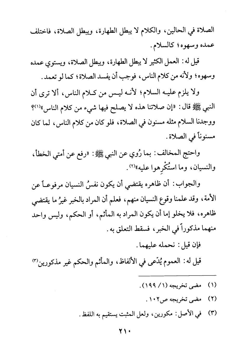 والجواب: أن ظاهره يقتضي أن يكون نفسُ النسيان مرفوعًا عن الأمة، وقد علمنا وقوع النسيان منهم، فعلم أن المراد بالخبر غيرُ ما يقتضي ظاهره، فلا يخلو إما أن يكون المراد به المأثم، أو الحكم، وليس واحد منهما مذكورًا في الخبر، فسقط التعلق به.