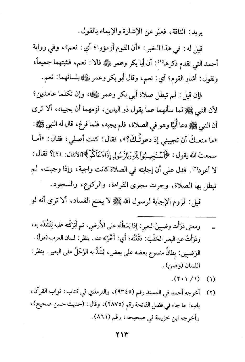فإن قيل: لم تبطل صلاة أبي بكر وعمر - رضي الله عنهما -، وإن تكلما عامدين؛ لأن النبي - صلى الله عليه وسلم - لما سألهما عما يقول ذو اليدين، لزمهما أن يجيباه، ألا ترى أن النبي - صلى الله عليه وسلم - دعا أُبيًّا وهو في الصلاة، فلم يجبه، فلما فرغ، قال له النبي - صلى الله عليه وسلم -: "ما منعكَ أن تجيبني إذ دعوتُكَ؟ "، فقال: كنت أصلي، فقال: "أما سمعتَ الله يقول: {اسْتَجِيبُوا لِلَّهِ وَلِلرَّسُولِ إِذَا دَعَاكُمْ} [الأنفال: 24]؟ فقال: لا أعود (¬2). فدل على أن إجابته في الصلاة كانت واجبة، وإذا وجبت، لم تبطل بها الصلاة، وجرت مجرى القراءة، والركوع، والسجود.