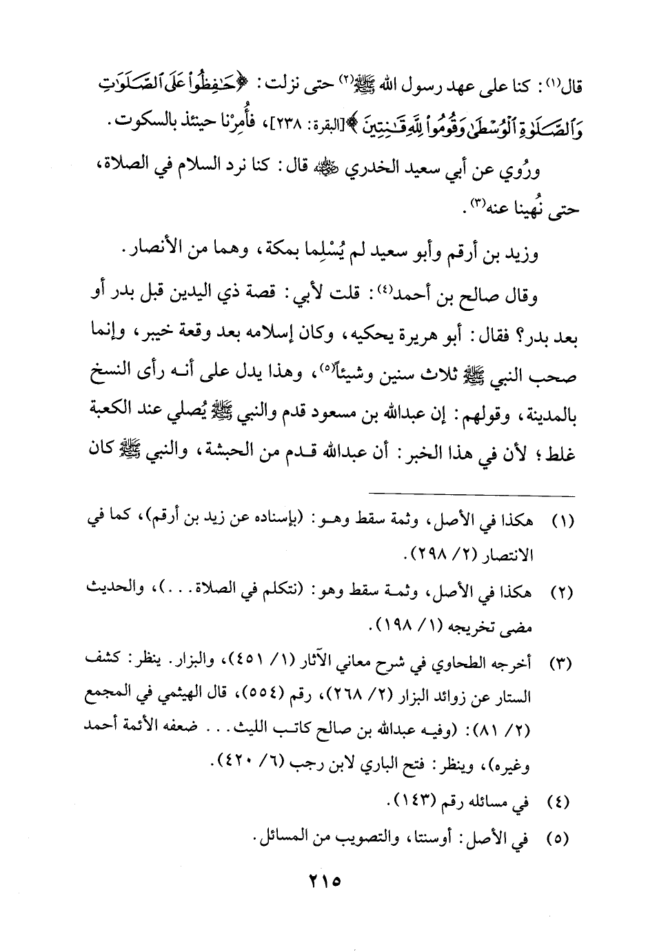 وقال صالح بن أحمد (¬4): قلت لأبي: قصة ذي اليدين قبل بدر أو بعد بدر؟ فقال: أبو هريرة يحكيه، وكان إسلامه بعد وقعة خيبر، وإنما صحب النبي - صلى الله عليه وسلم - ثلاث سنين وشيئًا (¬5)، وهذا يدل على أنه رأى النسخ بالمدينة، وقولهم: إن عبد الله بن مسعود قدم والنبي - صلى الله عليه وسلم - يُصلي عند الكعبة غلط؛ لأن في هذا الخبر: أن عبد الله قدم من الحبشة، والنبي - صلى الله عليه وسلم - كان