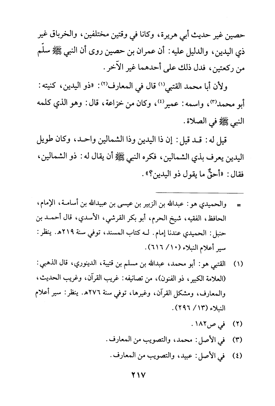 ولأن أبا محمد القتبي (¬1) قال في المعارف (¬2): "ذو اليدين، كنيته: أبو محمد (¬3)، واسمه: عمير (¬4)، وكان من خزاعة، قال: وهو الذي كلمه النبي - صلى الله عليه وسلم - في الصلاة.