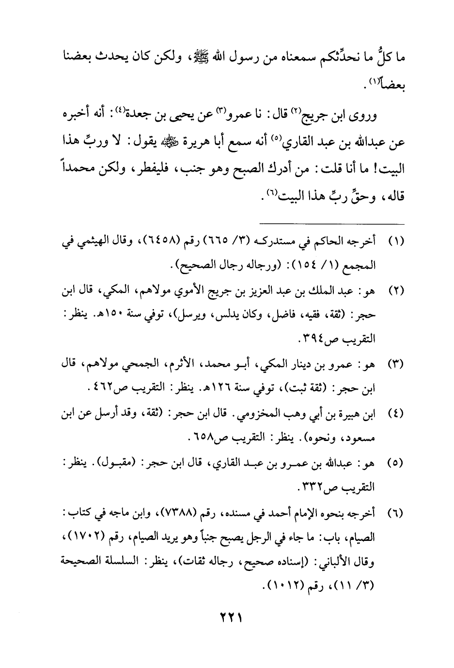 (¬6) أخرجه بنحوه الإمام أحمد في مسنده، رقم (7388)، وابن ماجه في كتاب: الصيام، باب: ما جاء في الرجل يصبح جنبًا وهو يريد الصيام، رقم (1702)، وقال الألباني: (إسناده صحيح، رجاله ثقات)، ينظر: السلسلة الصحيحة (3/ 11)، رقم (1012).