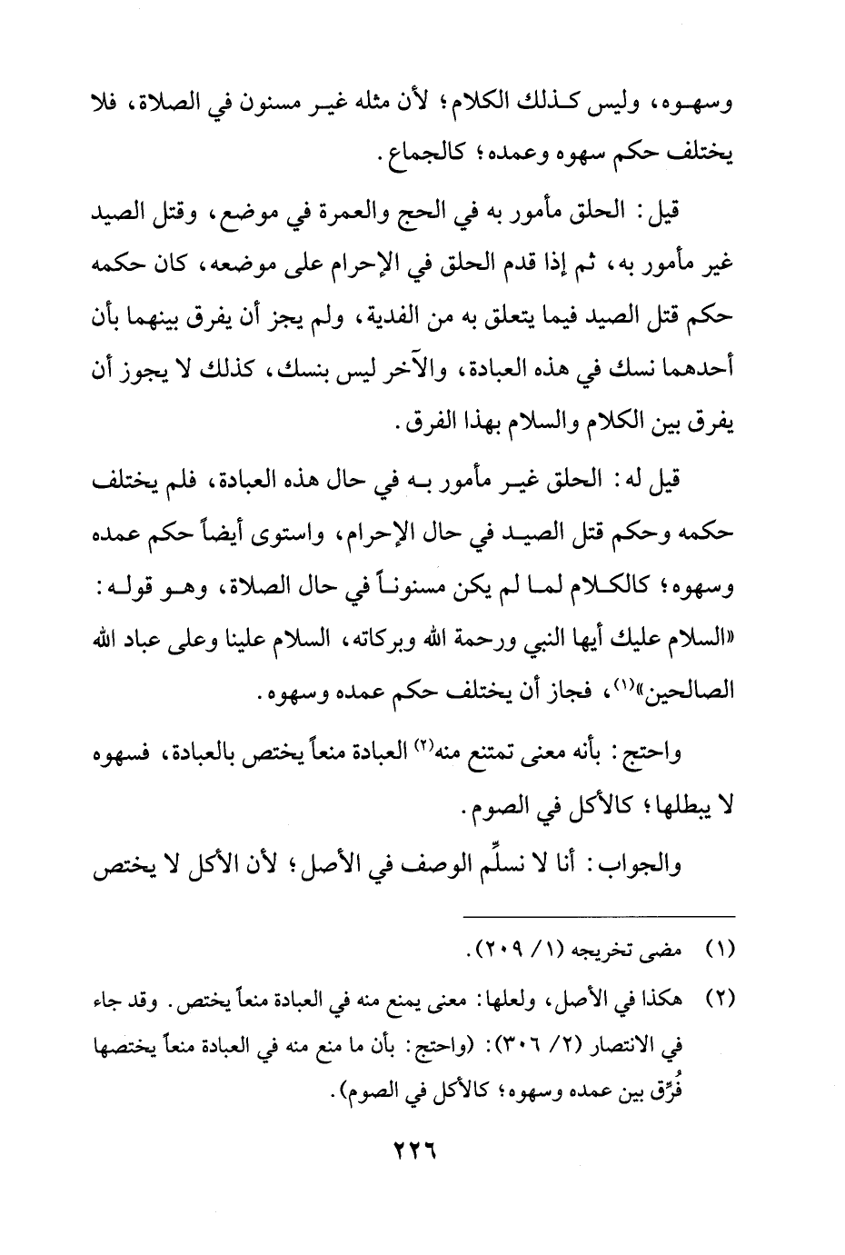 قيل له: الحلق غير مأمور به في حال هذه العبادة، فلم يختلف حكمه وحكم قتل الصيد في حال الإحرام، واستوى أيضًا حكم عمده وسهوه؛ كالكلام لما لم يكن مسنونًا في حال الصلاة، وهو قوله: "السلام عليك أيها النبي ورحمة الله وبركاته، السلام علينا وعلى عباد الله الصالحين" (¬1)، فجاز أن يختلف حكم عمده وسهوه.