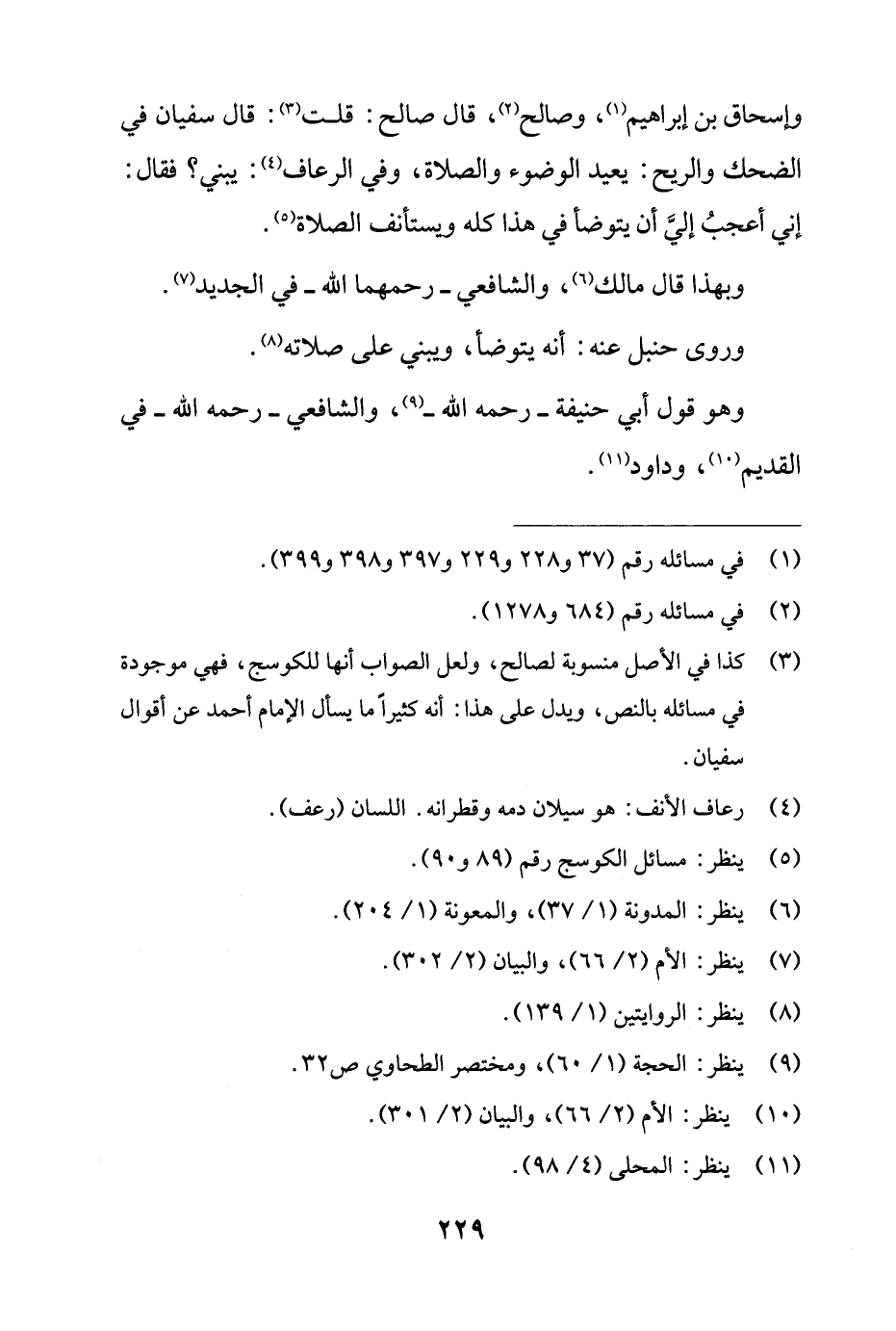 وإسحاق بن إبراهيم (¬1)، وصالح (¬2)، قال صالح: قلت (¬3): قال سفيان في الضحك والريح: يعيد الوضوء والصلاة، وفي الرعاف (¬4): يبني؟ فقال: إني أعجبُ إليَّ أن يتوضأ في هذا كله ويستأنف الصلاة (¬5).