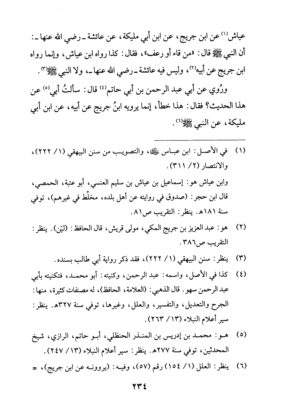(¬4) كذا في الأصل، واسمه: عبد الرحمن، وكنيته: أبو محمد، فتكنيته بأبي عبد الرحمن سهو. قال الذهبي: (العلامة، الحافظ)، له مصنفات كثيرة، منها: الجرح والتعديل، والتفسير، والعلل، وغيرها، توفي سنة 327 هـ. ينظر: سير أعلام النبلاء (13/ 263).