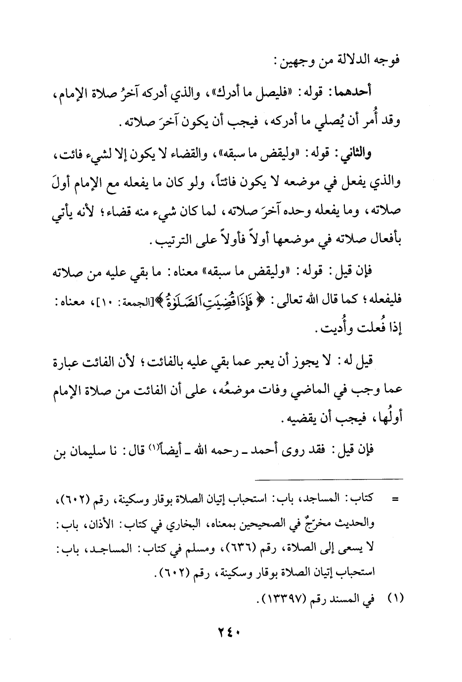والثاني: قوله: "وليقض ما سبقه"، والقضاء لا يكون إلا لشيء فائت، والذي يفعل في موضعه لا يكون فائتًا، ولو كان ما يفعله مع الإمام أولَ صلاته، وما يفعله وحده آخرَ صلاته، لما كان شيء منه قضاء؛ لأنه يأتي بأفعال صلاته في موضعها أولًا فأولًا على الترتيب.