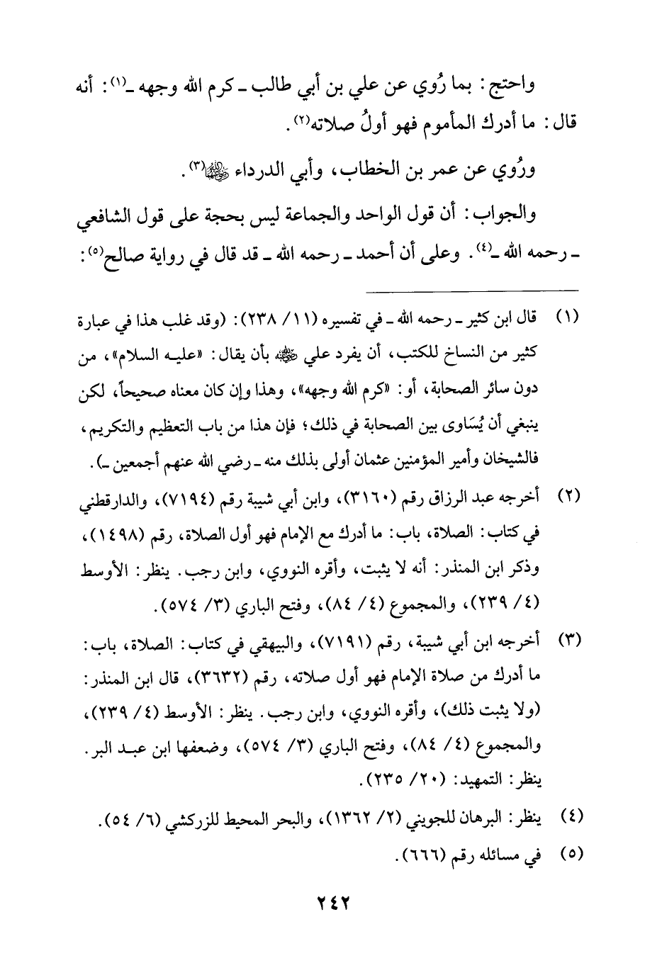 (¬3) أخرجه ابن أبي شيبة، رقم (7191)، والبيهقي في كتاب: الصلاة، باب: ما أدرك من صلاة الإمام فهو أول صلاته، رقم (3632)، قال ابن المنذر: (ولا يثبت ذلك)، وأقره النووي، وابن رجب. ينظر: الأوسط (4/ 239)، والمجموع (4/ 84)، وفتح الباري (3/ 574)، وضعفها ابن عبد البر. ينظر: التمهيد: (20/ 235).