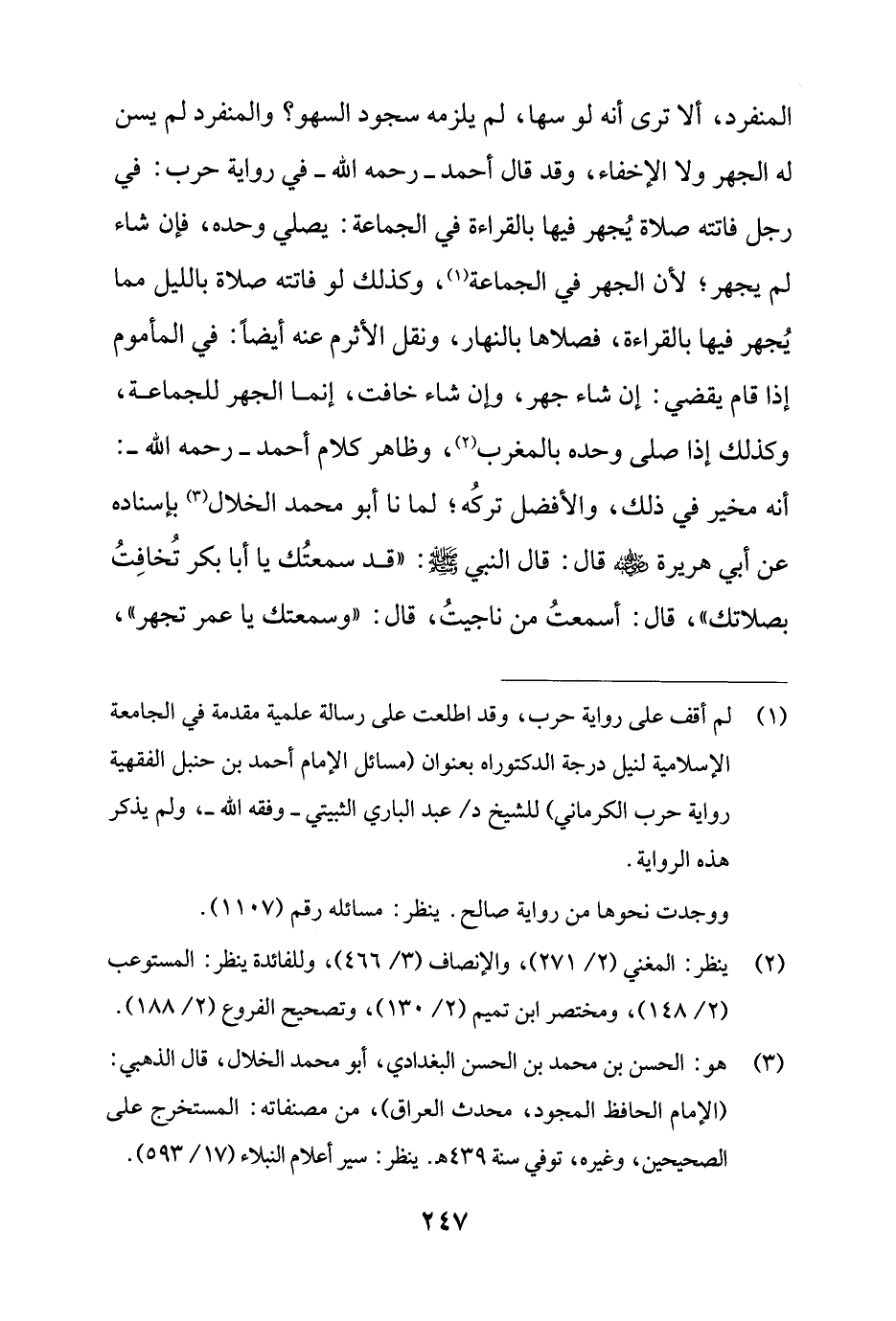 المنفرد، ألا ترى أنه لو سها، لم يلزمه سجود السهو؟ والمنفرد لم يسن له الجهر ولا الإخفاء، وقد قال أحمد - رحمه الله - في رواية حرب: في رجل فاتته صلاة يُجهر فيها بالقراءة في الجماعة: يصلي وحده، فإن شاء لم يجهر؛ لأن الجهر في الجماعة (¬1)، وكذلك لو فاتته صلاة بالليل مما يُجهر فيها بالقراءة، فصلاها بالنهار، ونقل الأثرم عنه أيضًا: في المأموم إذا قام يقضي: إن شاء جهر، وإن شاء خافت، إنما الجهر للجماعة، وكذلك إذا صلى وحده بالمغرب (¬2)، وظاهر كلام أحمد - رحمه الله -: أنه مخير في ذلك، والأفضل تركُه؛ لما نا أبو محمد الخلال (¬3) بإسناده عن أبي هريرة - رضي الله عنه - قال: قال النبي - صلى الله عليه وسلم -: "قد سمعتُك يا أبا بكر تُخافِتُ بصلاتك"، قال: أسمعتُ من ناجيتُ، قال: "وسمعتك يا عمر تجهر"،