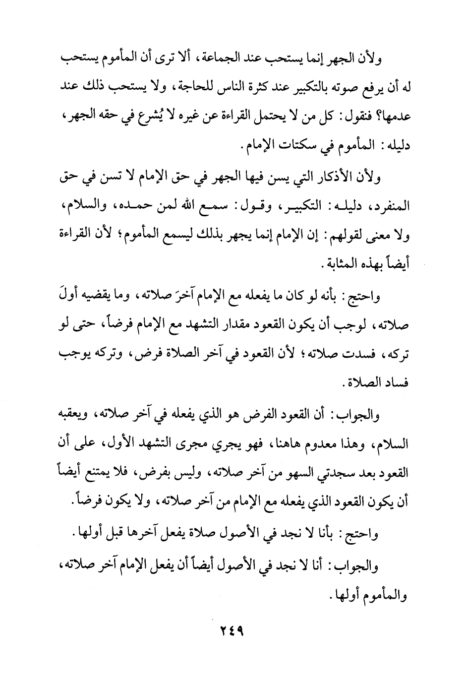 والجواب: أن القعود الفرض هو الذي يفعله في آخر صلاته، ويعقبه السلام، وهذا معدوم ها هنا، فهو يجري مجرى التشهد الأول، على أن القعود بعد سجدتي السهو من آخر صلاته، وليس بفرض، فلا يمتنع أيضًا أن يكون القعود الذي يفعله مع الإمام من آخر صلاته، ولا يكون فرضًا.