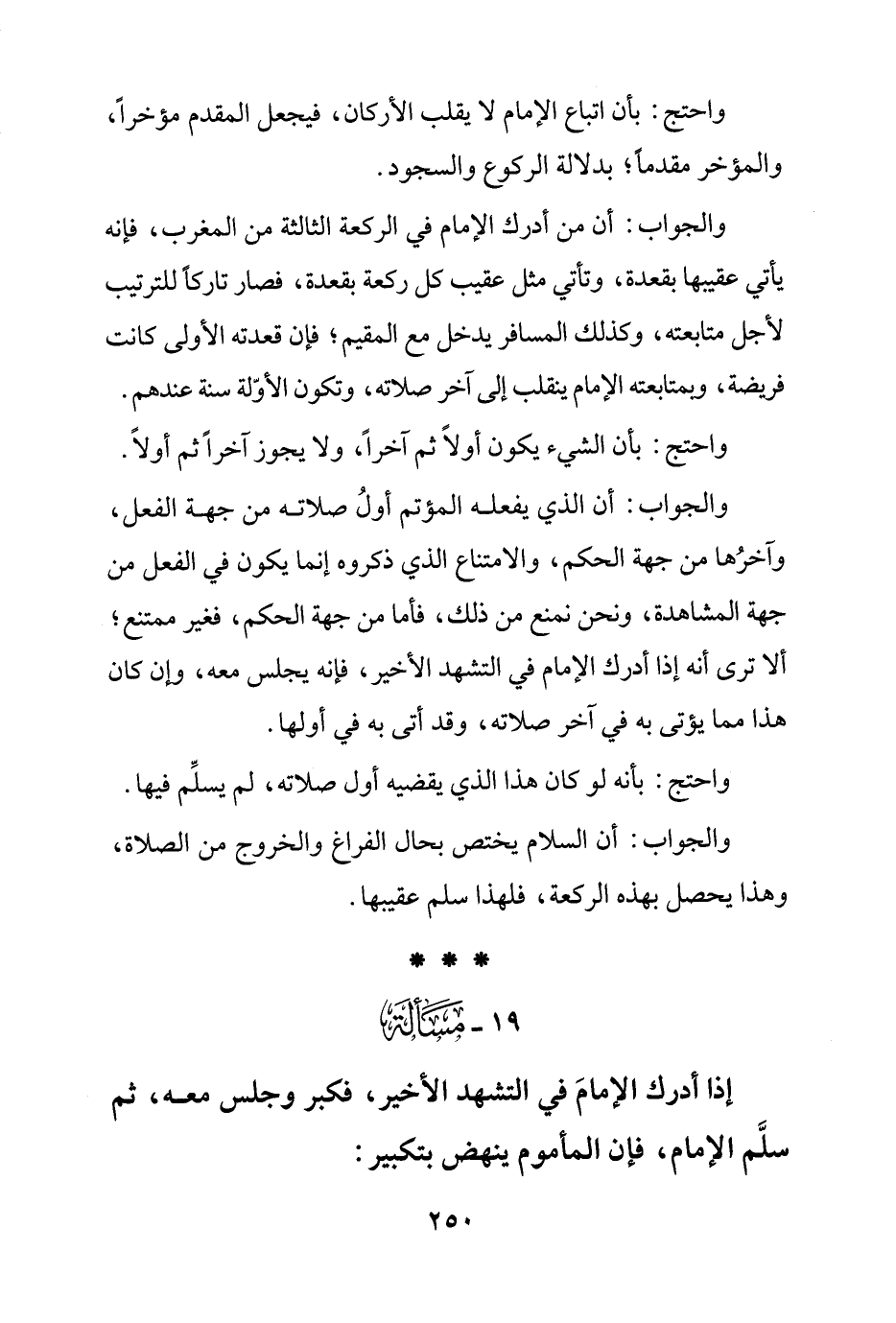 والجواب: أن من أدرك الإمام في الركعة الثالثة من المغرب، فإنه يأتي عقيبها بقعدة، وتأتي مثل عقيب كل ركعة بقعدة، فصار تاركًا للترتيب لأجل متابعته، وكذلك المسافر يدخل مع المقيم؛ فإن قعدته الأولى كانت فريضة، وبمتابعته الإمام ينقلب إلى آخر صلاته، وتكون الأوّلة سنة عندهم.