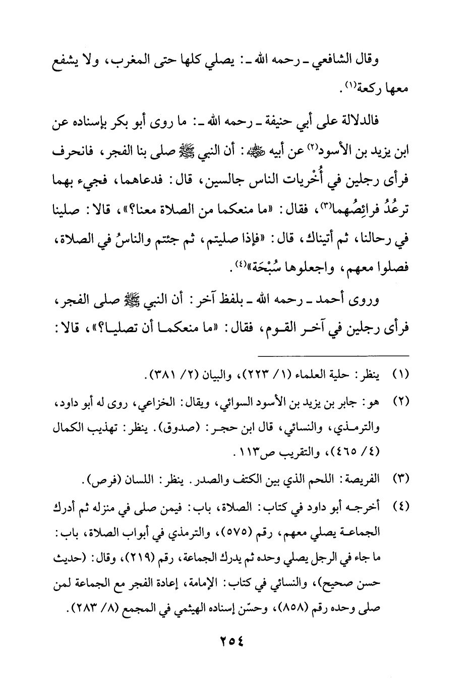 فالدلالة على أبي حنيفة - رحمه الله -: ما روى أبو بكر بإسناده عن ابن يزيد بن الأسود (¬2) عن أبيه - رضي الله عنه -: أن النبي - صلى الله عليه وسلم - صلى بنا الفجر، فانحرف فرأى رجلين في أُخْريات الناس جالسين، قال: فدعاهما، فجيء بهما ترعُدُ فرائِصُهما (¬3)، فقال: "ما منعكما من الصلاة معنا؟ "، قالا: صلينا في رحالنا، ثم أتيناك، قال: "فإذا صليتم، ثم جئتم والناسُ في الصلاة، فصلوا معهم، واجعلوها سُبْحَة" (¬4).