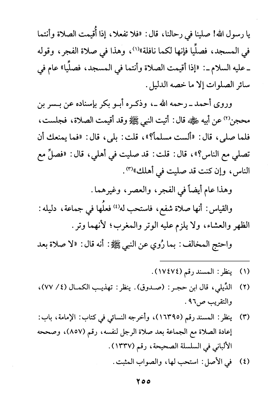 وروى أحمد - رحمه الله -، وذكره أبو بكر بإسناده عن بسر بن محجن (¬2) عن أبيه - رضي الله عنه - قال: أتيت النبي - صلى الله عليه وسلم - وقد أقيمت الصلاة، فجلست، فلما صلى، قال: "ألست مسلمًا؟ "، قلت: بلى، قال: "فما يمنعك أن تصلي مع الناس؟ "، قال: قلت: قد صليت في أهلي، قال: "فصلِّ مع الناس، وإن كنت قد صليت في أهلك" (¬3).